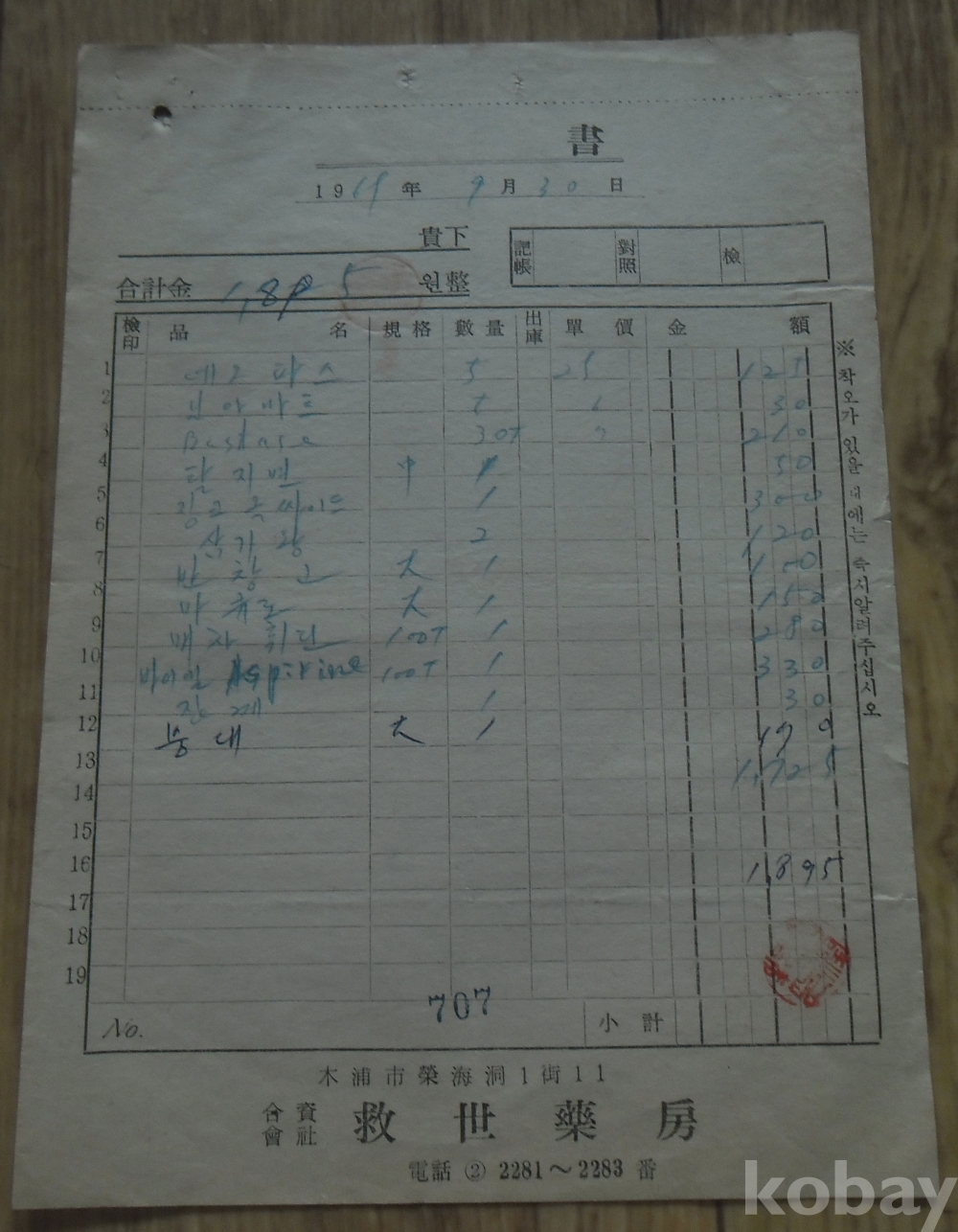 옛 영수증(계산서): 1969년 구세약방(목포)