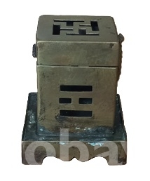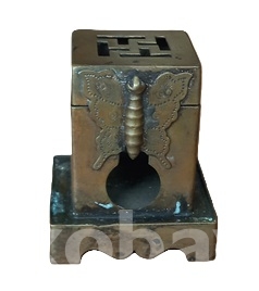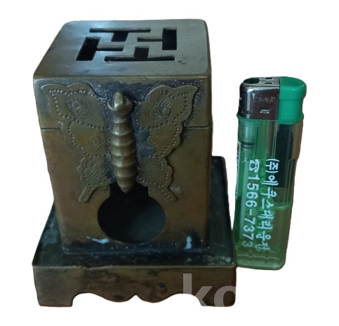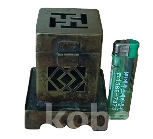 비고, 황동으로 담배통과 받침이 4각형이네요. 뚜껑의 가운데에 卍자문이 그리고 전면에 범나비조각을 부착하여 한층 고급스럽게 만들었읍니다. 통의 앞면에 담배통이 들어가는 구멍에 반대쪽에는 두 개의 마름모꼴 모양이, 또다른 쪽에는 팔괘의 이離가 대칭으로 투각되어 있읍니다. 한편 이離는 사괘의 불火을 상징한다 하고.. 담배는 임진왜란을 통해 들어왔다 하니 이 휴연대는 최소한 그 이후에 제작된 것이 아닐까? 싶고. 보면 볼수록 조선유기 공예의 걸작입니다. 삼국시대의 백제 금동대향로와 신라범종, 고려의 향완, 정병이 있다면 조선에는 이 휴연대가 있다하지 않을까요?. 거기에 버금간다 하지는 않을까? 그런데 왜 조선에서는 이미 같은 용도의 싸고 간단한 놋재털이가 있는데 구지 또다른 이런 도구를 정성을 다해 만들었다 할까? 골동품 사랑하는 사람으로서 이런 명품을 일찍이 알면서도 그 값어치를 소홀히 해 다시 사고 판다는 것은 옛 선조님들에게 송구하기 그지 없읍니다. 하도 사는게 절박해 여기에 올리긴 하지만, 저도 다시는 구할 수가 없는 기물이라서.. 속내는 판매가 되지 않았으면 하는 마음도 있고 하여튼 생각이 복잡합니다. 상태는 사진에 보이는 세월의 흔적, 녹소와 검정 땟물외 뚜껑의 정상작동 개폐 등 일체 흠없고 완전합니다. 사진을 아주 여러장 올렸으니 자세히 살펴봐 주시기 바랍니다.