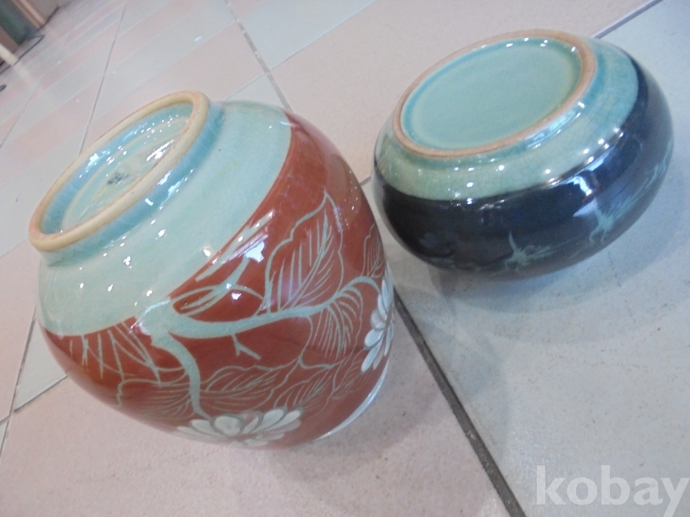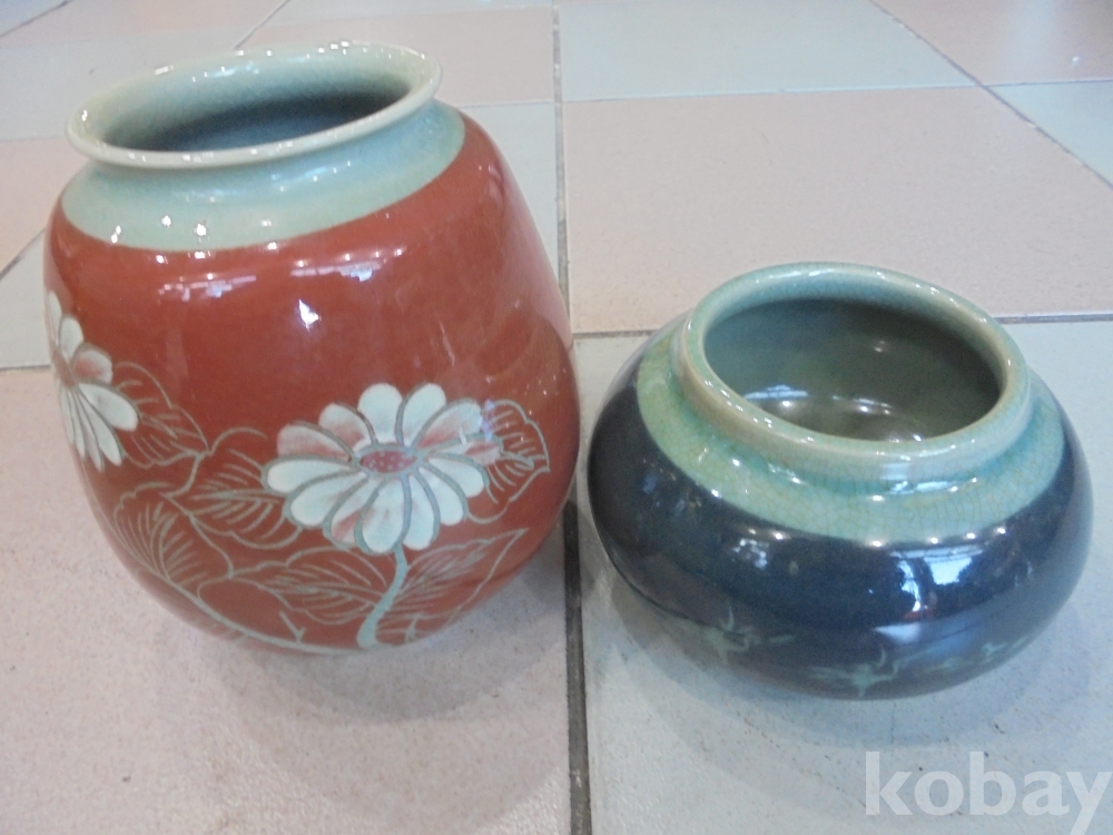 홍자가 돌아가고 꽃있고 위아래 연청자가있는 아무지고 수준높게 잘만든 연홍연청자 항아리와 진청이돌어간데 봉황이 날고있고