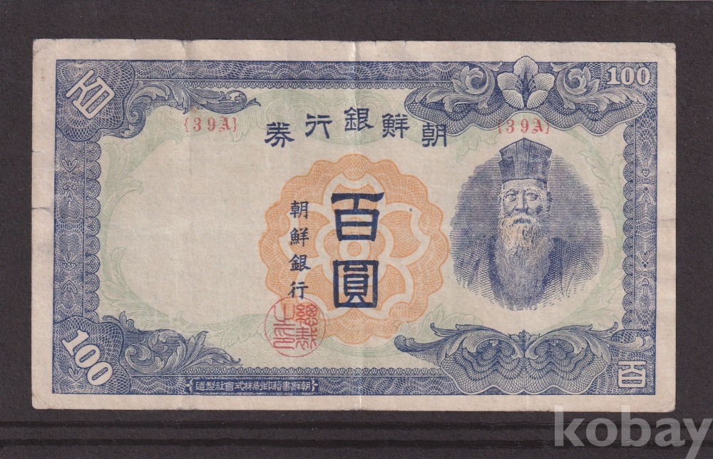 - 조선은행 1947년 무백원 판번호 39A 사용제 지폐