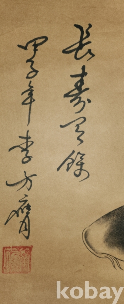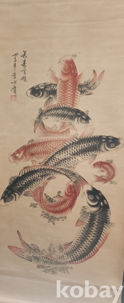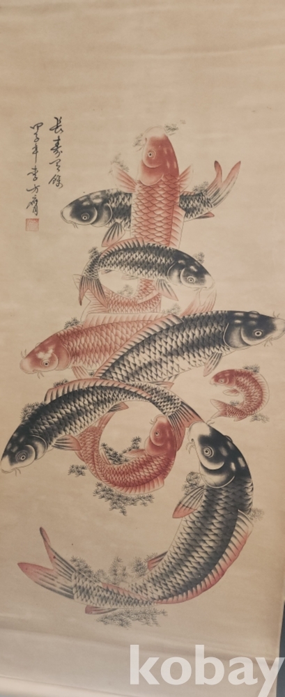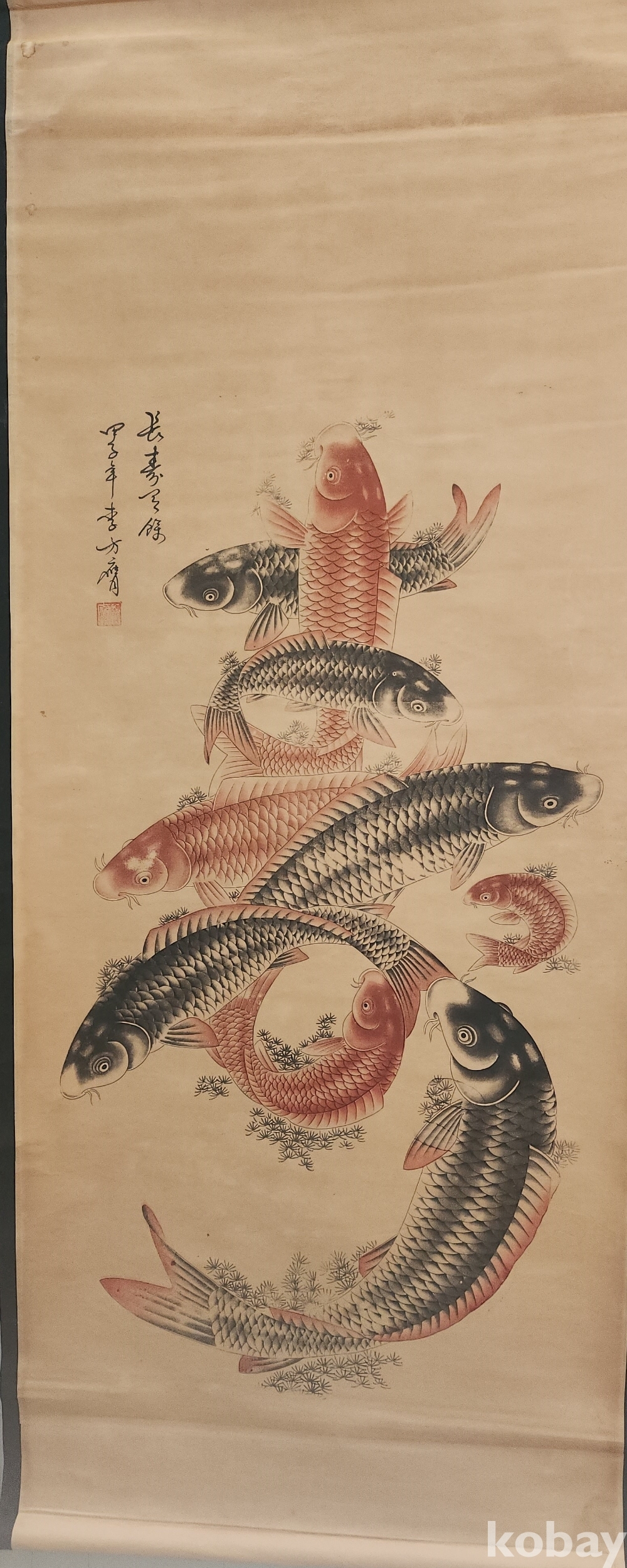 청나라 문인화가 이방응 作 비단에 채색한 비단 잉어로 수(壽) 문자도 족자입니다,