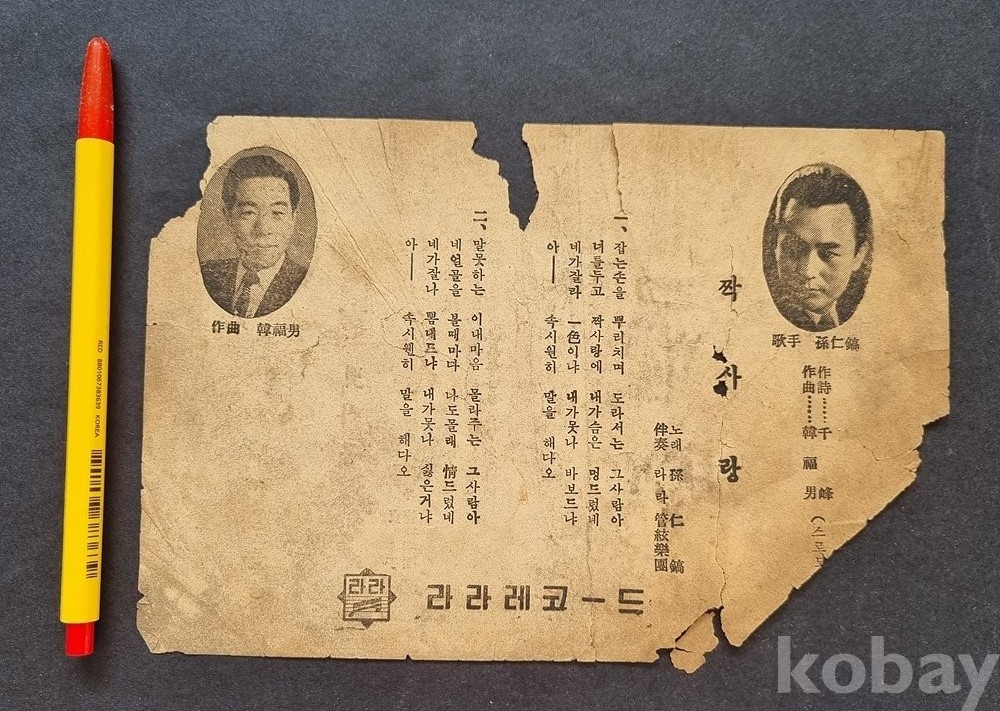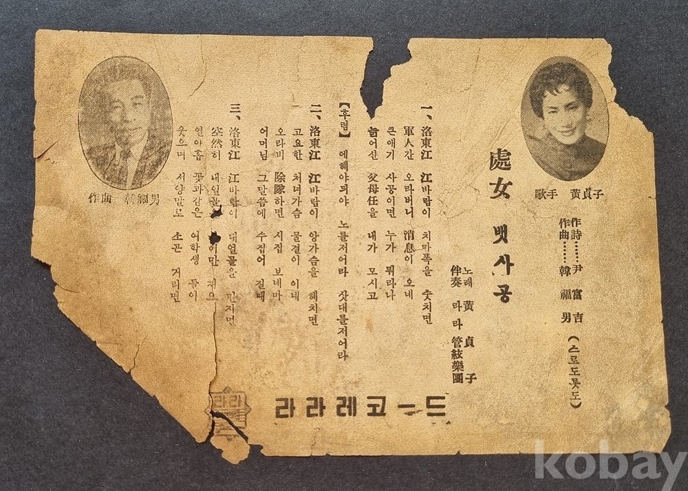 ro-43 / 해방전 ~일제강점기 오리지널 sp음반 (돌판) 가사지 (희귀 돌판 가사지) "처녀뱃사공, 짝사랑"