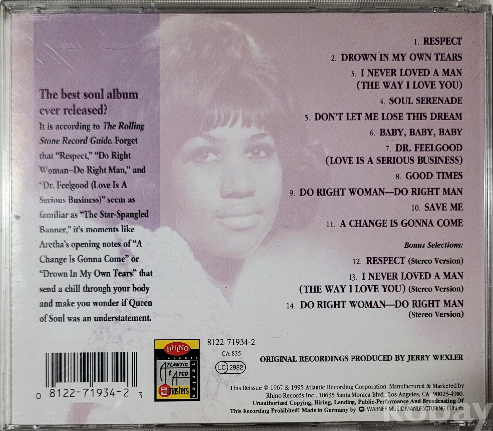 물 품 명 | [POP] 미국반 / 아레사 프랭클린 10th 정규앨범 : 첫번째 성공작 / 1995년 / 애틀란틱레코드 |