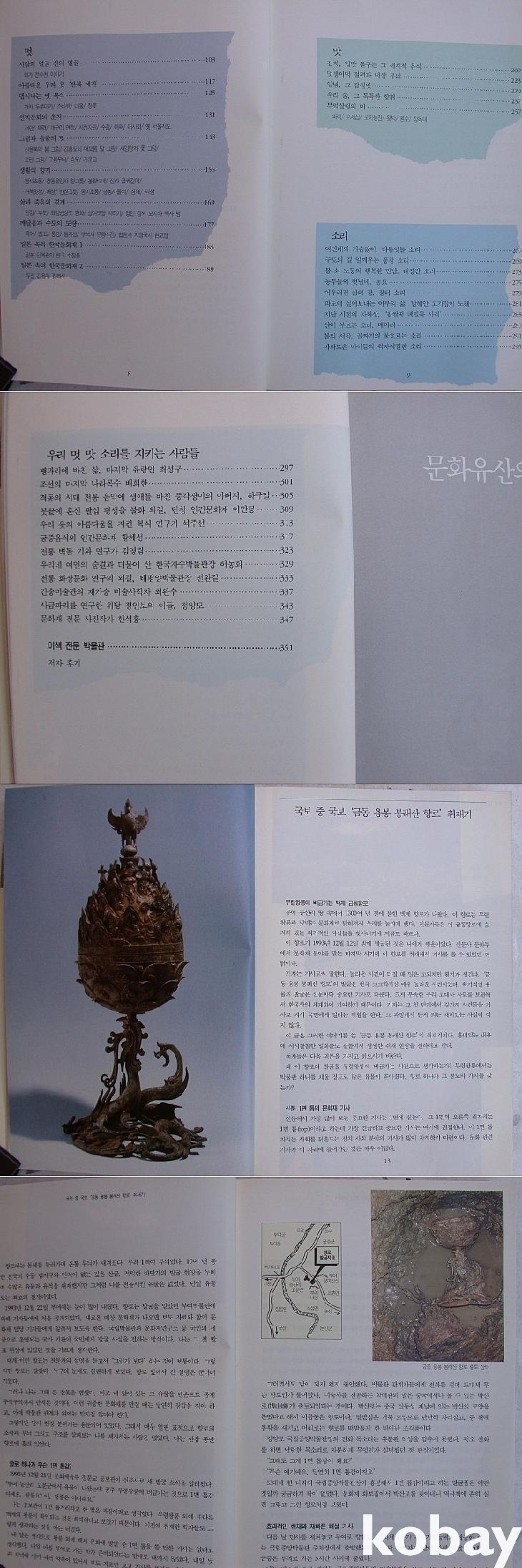 본문은 문화유산 추재현장, 멋, 맛, 소리, 우리 멋 맛 소리를 지키는 사람들로 크게 구분하여 구성하였다. 취재현장의 글 가운데 첫 번째인 '금동 용봉 봉래산 향로' 취재기가 단연 돋보인다. 사람들을 만난 끝의 기사들에서는 나라목수 배희한, 복식 연구가 석주선, 궁중음식 황혜성, 자수박물관 허동화, 간송미술관 최완수, 도자기 분야의 정양모 들이 실렸고, 그 중 배희한이 "조선목수가 되려면 날일꾼이어야 한다구. 조선집은 좋은 나무로만 지어야 하기 때문에 청부를 맡아선 그 값으로 지을 수가 없어. 한번 지으면 천년을 가야 하고 내부구조도 눈가림 없이 지어야 하기 때문에 속임수가 안 통해"라는 말이 짧은 글 가운데서 깊은 울림으로 들려온다. 맨뒤에는 지금처럼 많아지기 전인 당시의 특수박물관들에 대한 간단한 소개와 현황이 실려 있다.