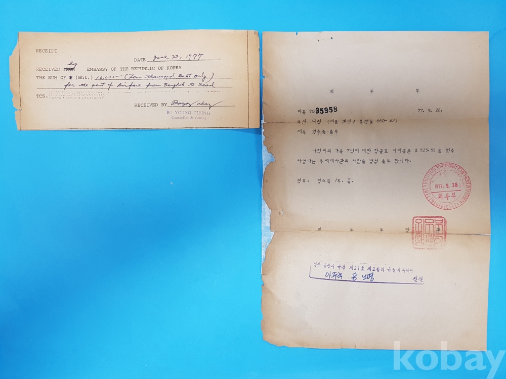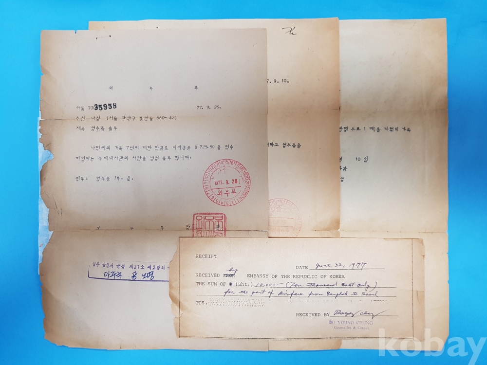 **** 주태국한국대사관 외교관의 항공료 관련 공문서 가족의 항공료 $725.50을 수령하였다는 내용이다 주태국한국대사가 외무부장관에게 보낸 문서 및 외무부장관이 보낸 공문서 이다