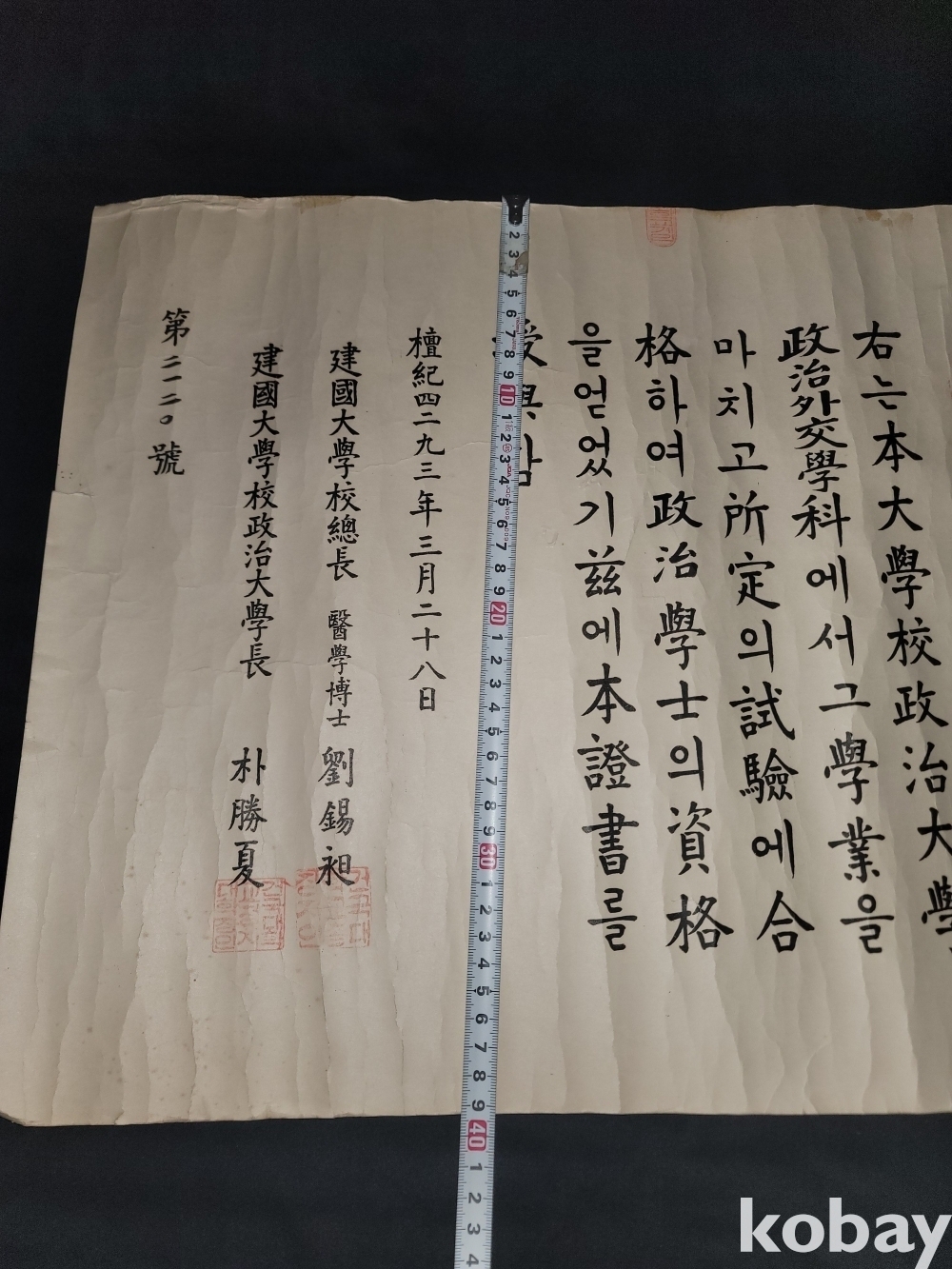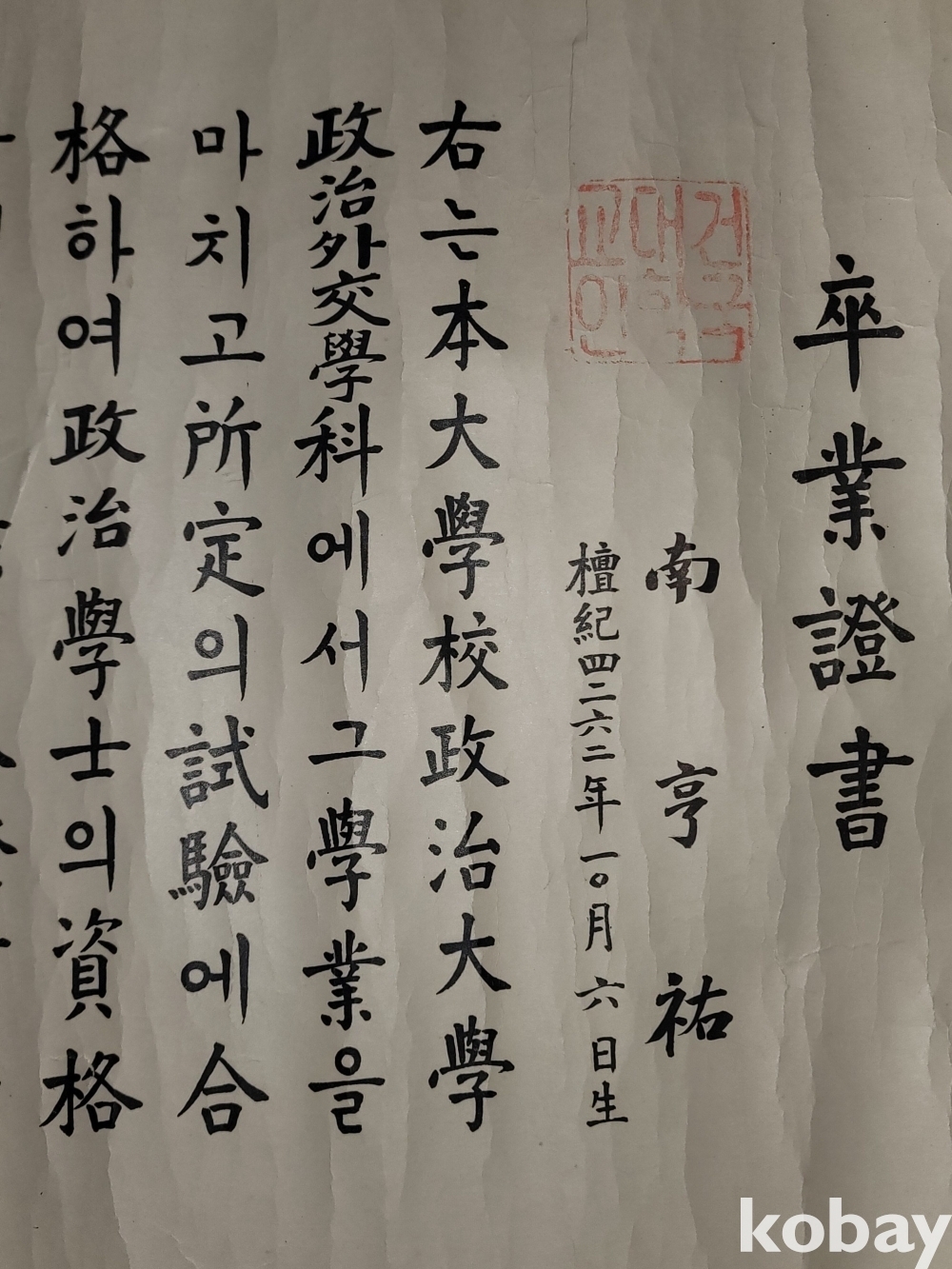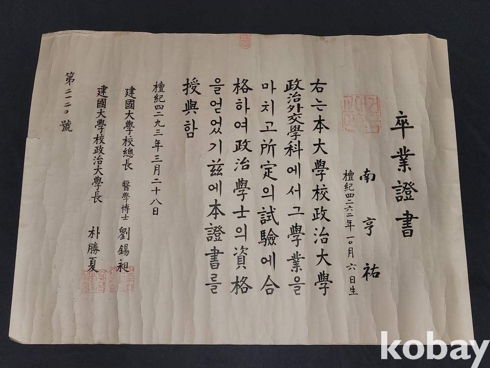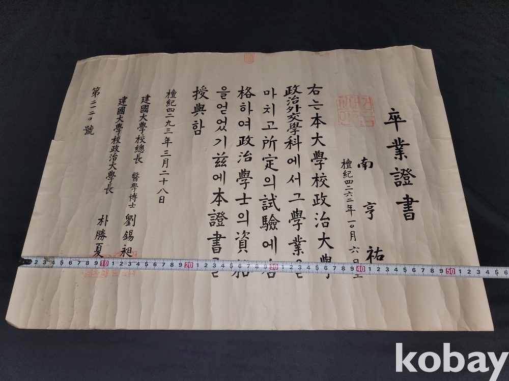 빈티지 세월 감이 느껴지는 희귀한 1960년도 건국대학교 정치학과 졸업증명서입니다.