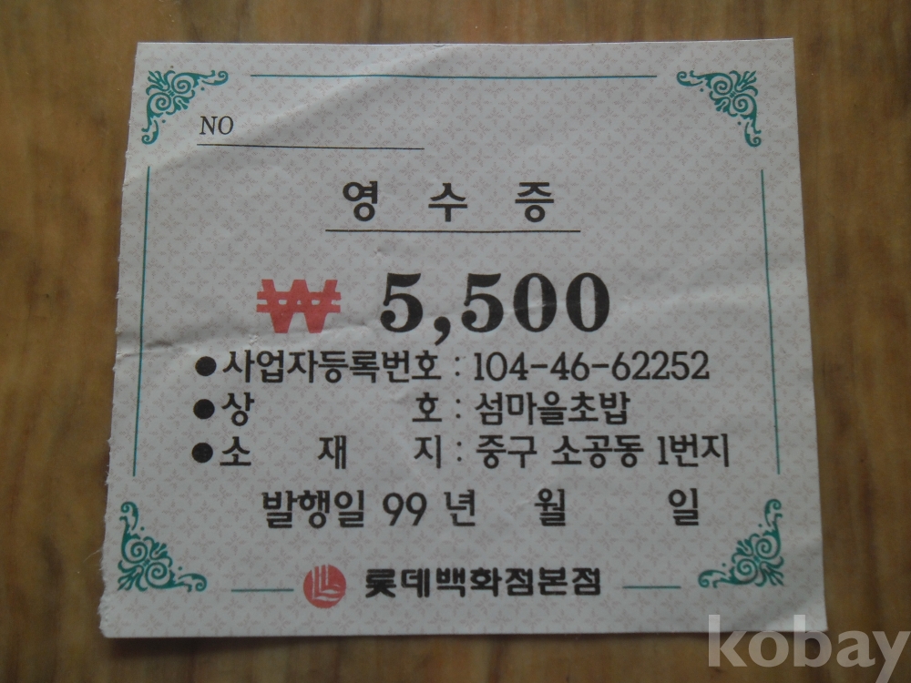 1999년 롯데백화점 섬마을초밥 발행 영수증