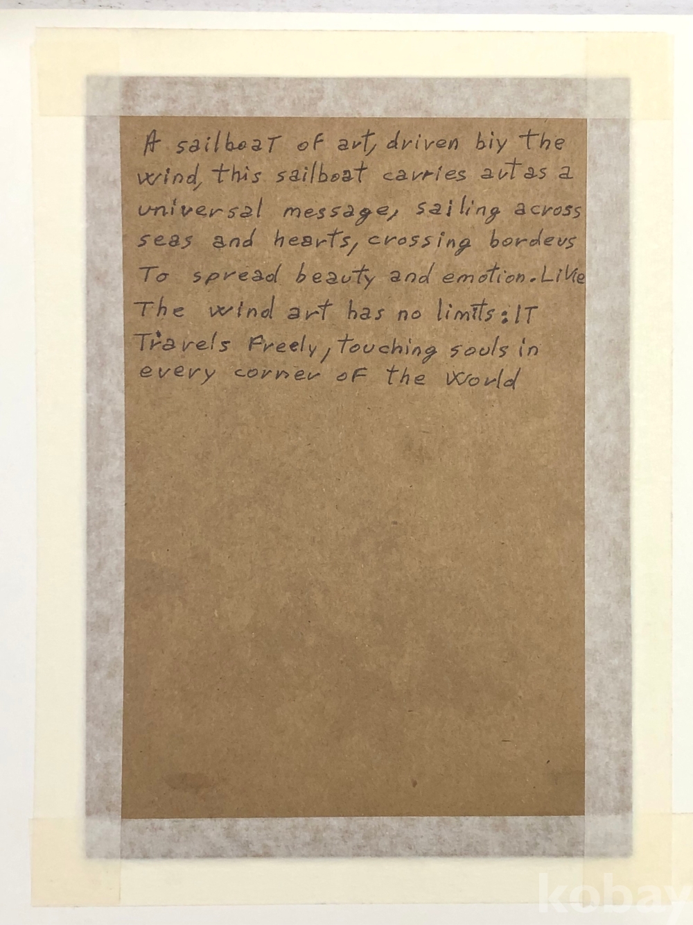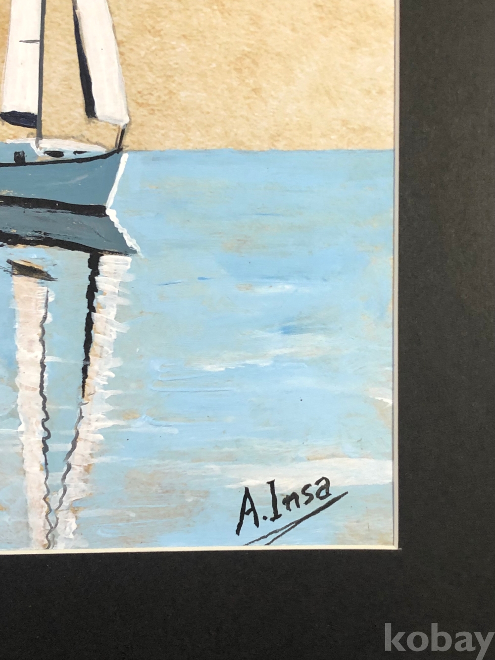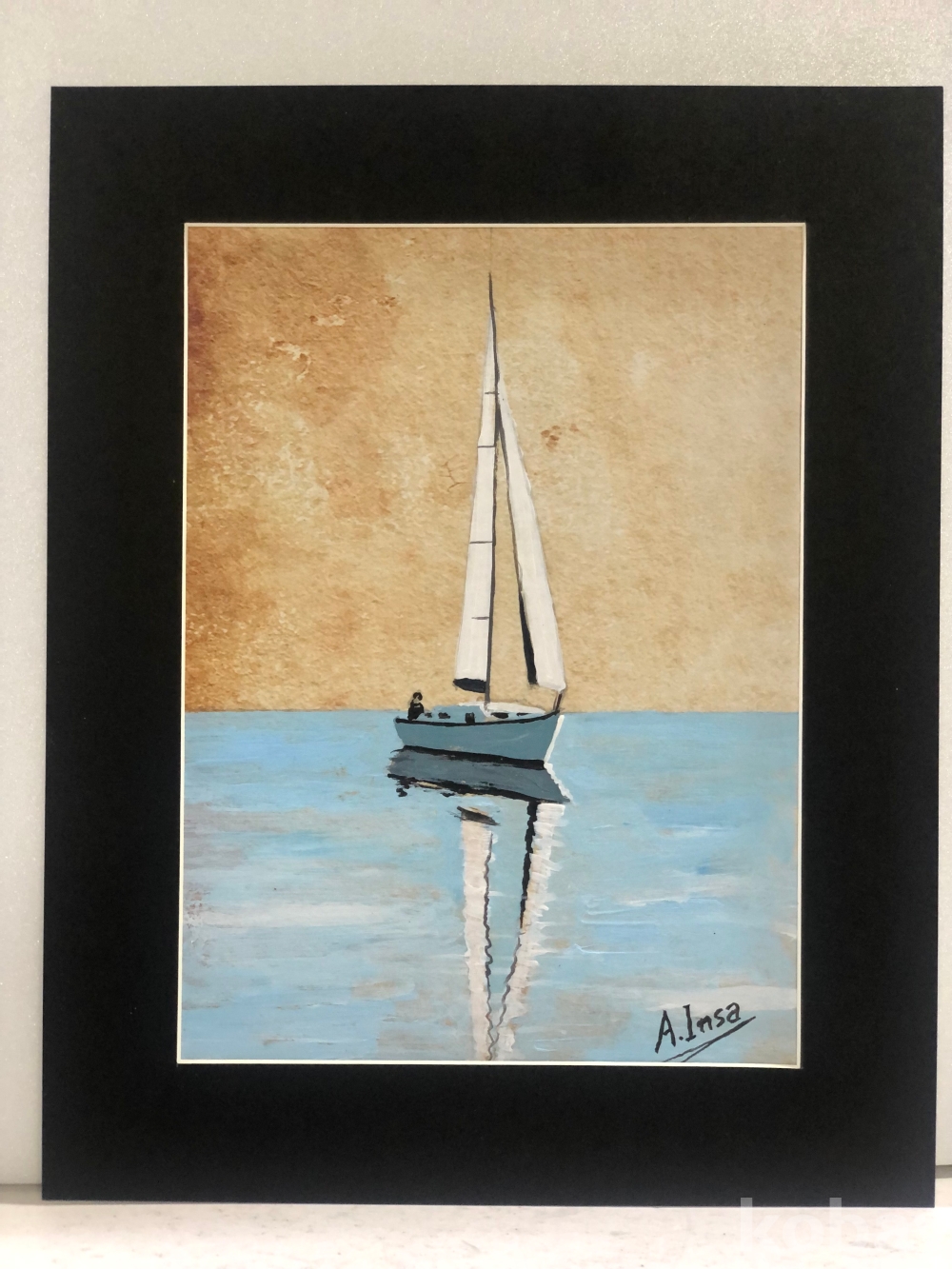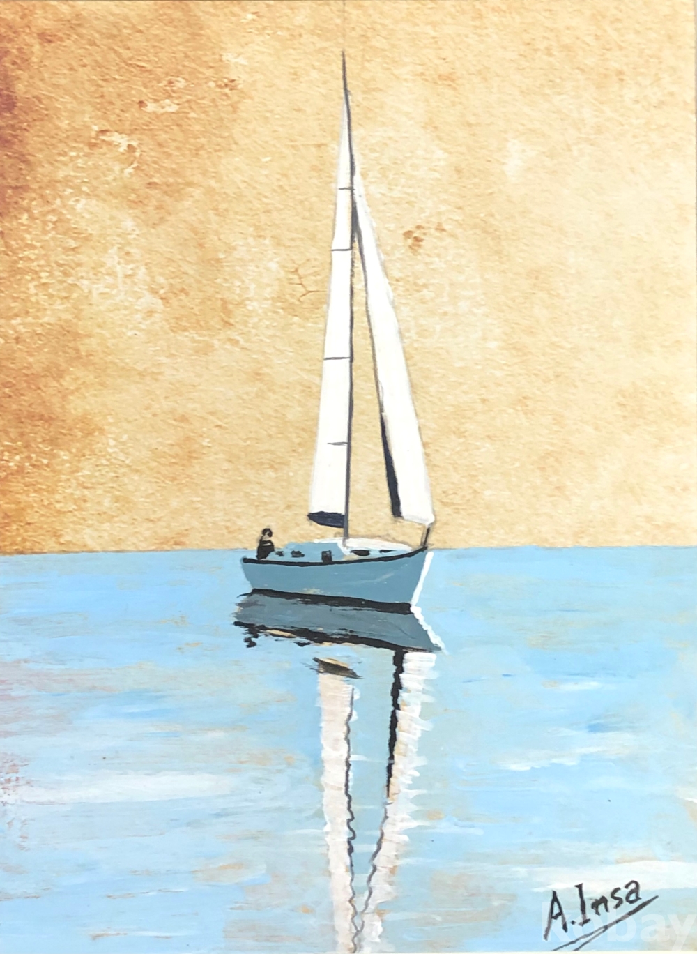 하얀 돛단배가 맑고 투명한 빛의 바다 위에 머물러 있는 순간을 담은 작품입니다.