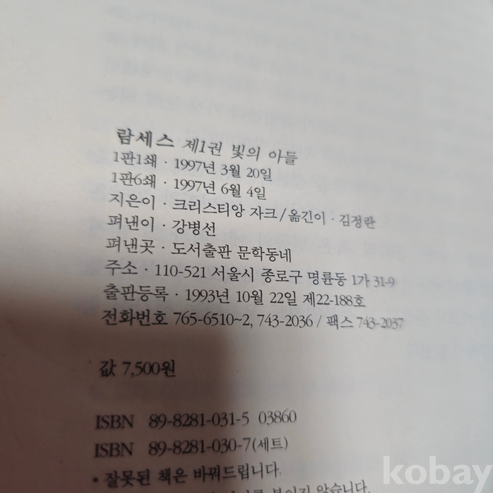 (((권당천원경매))) (((서적))) 람세스 (RAMSES) CHRISTIAN JACQ (크리스티앙 자크 장편소설) 1~5권 (완결편)(1997년 1판6쇄)