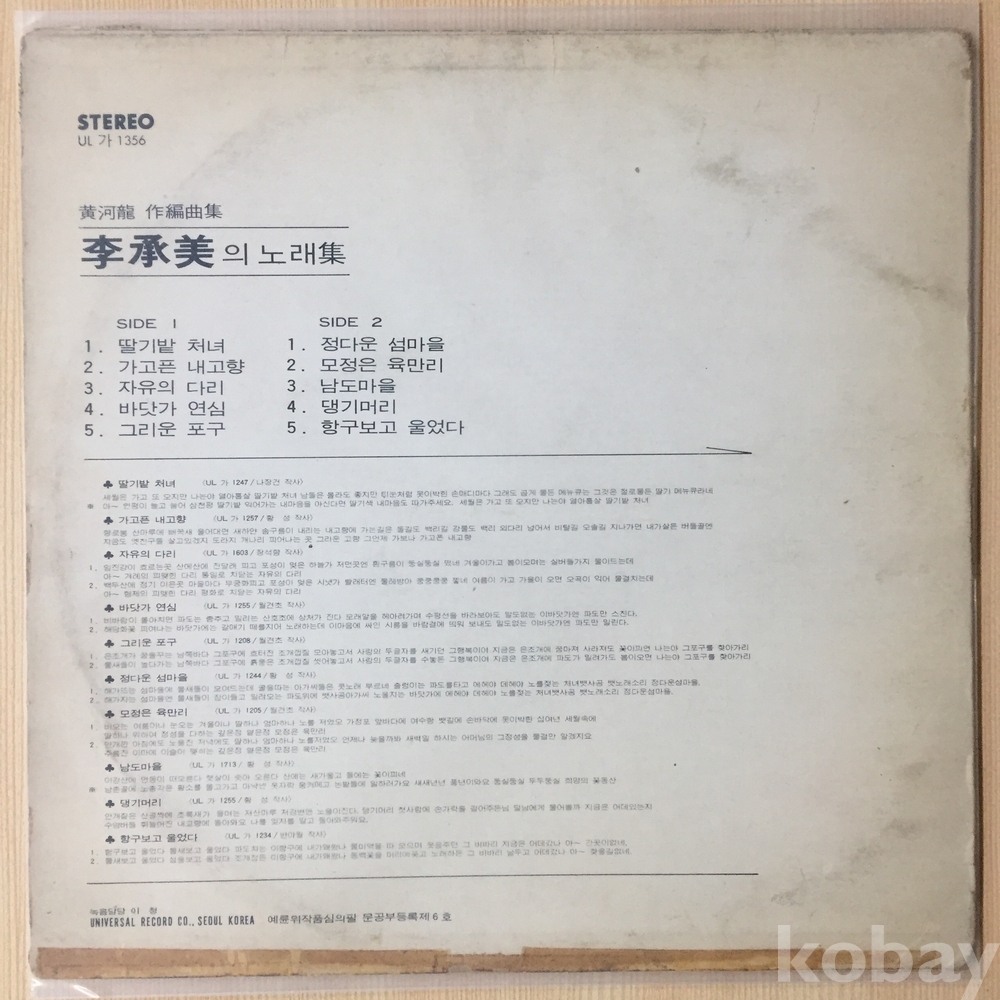 ⊙ 19??년 / 유니버살레코드 – UL 가 1356 / 황하룡 작품집
