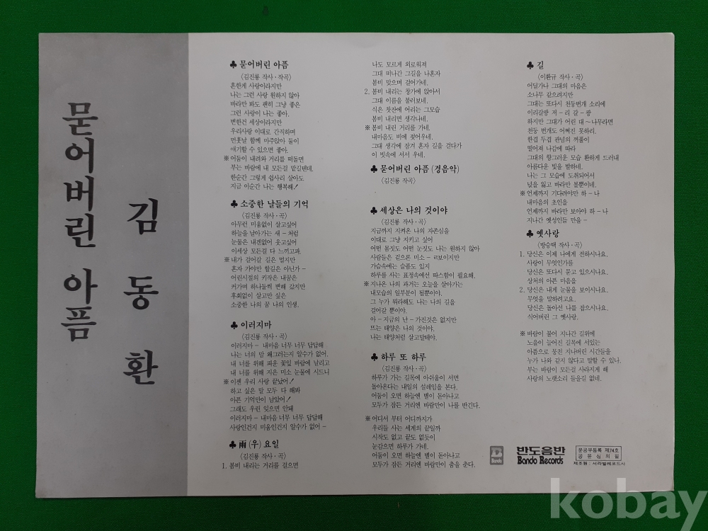 | 자켓상태 | EX : 약간의 마모, 모서리 찢김 존재 | 음반상태 | EX : 재생에 영향 없는 가벼운 기스 존재 | 발매정보 | 알수없음 | 가사지여부 | 유 |