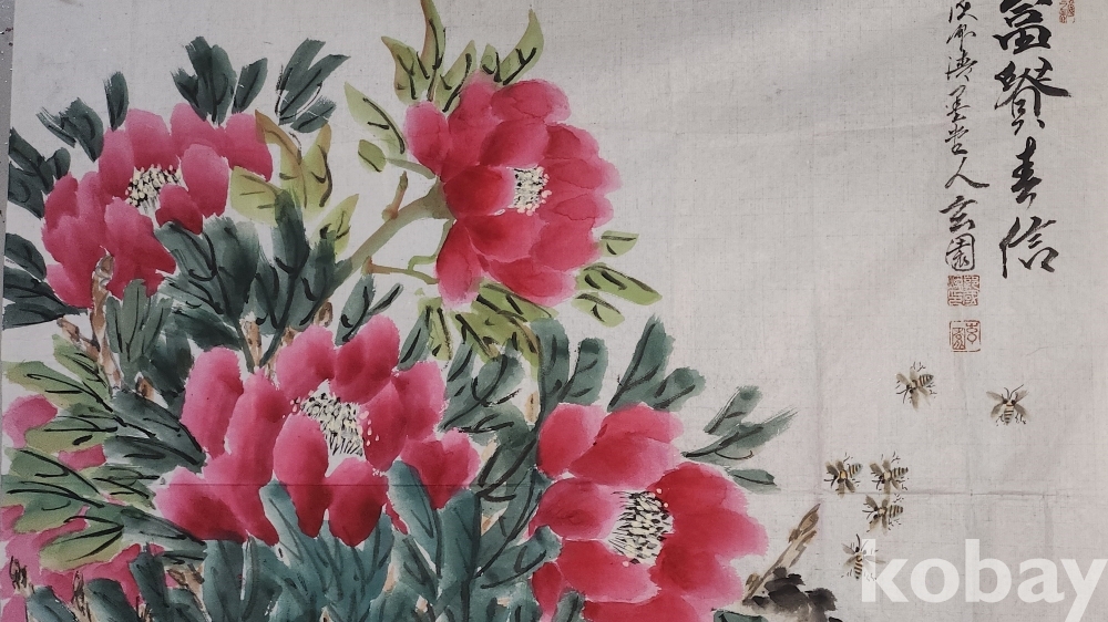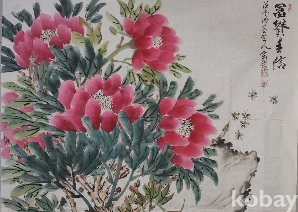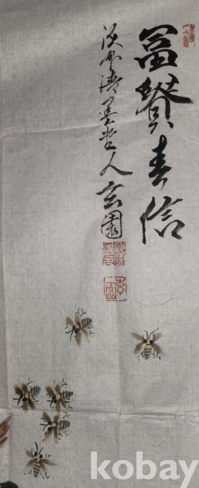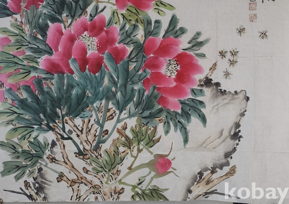 현원(玄園) 작가의 수결이 보이는 꽃과벌 작품입니다,