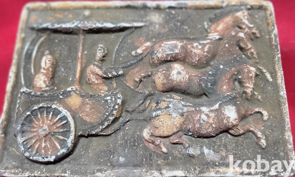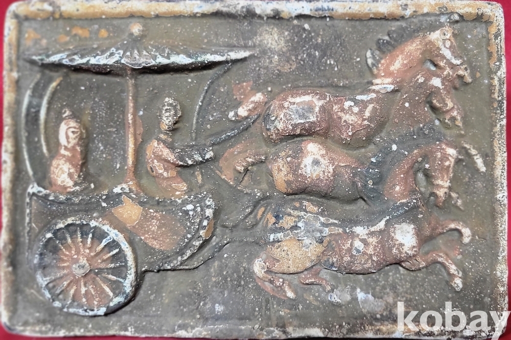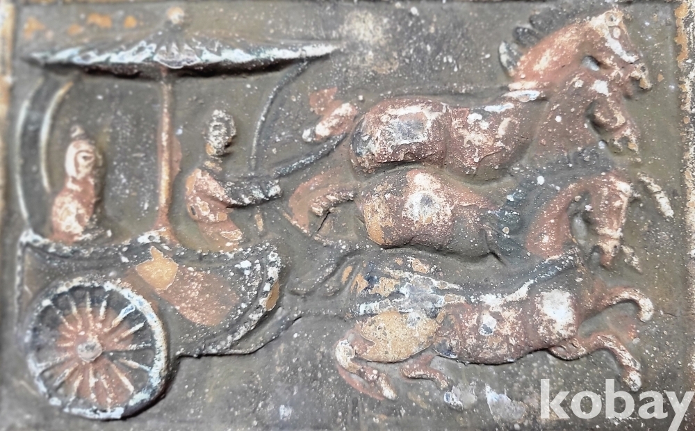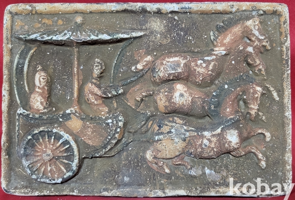 짱짱한 연대 갖춘 당채로 마감된 마차와 인물 문양 전돌입니다,