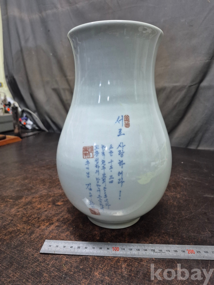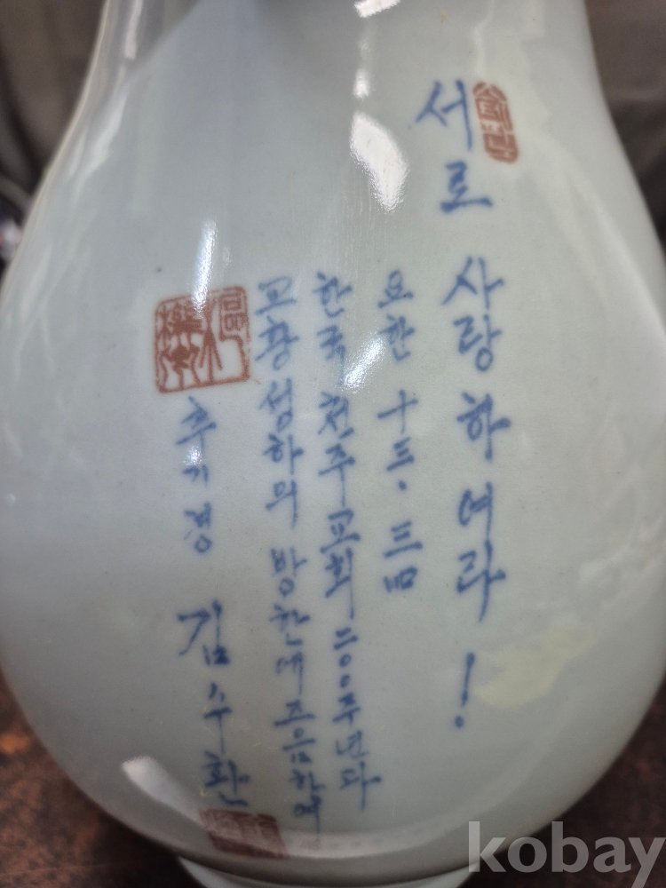 1980년대 한국 200주년 기념과 교황방한기념 추기경 김수환 추기경님의 친필 서로 사랑하여라 낙관이 찍힌 도자기 19*19*29