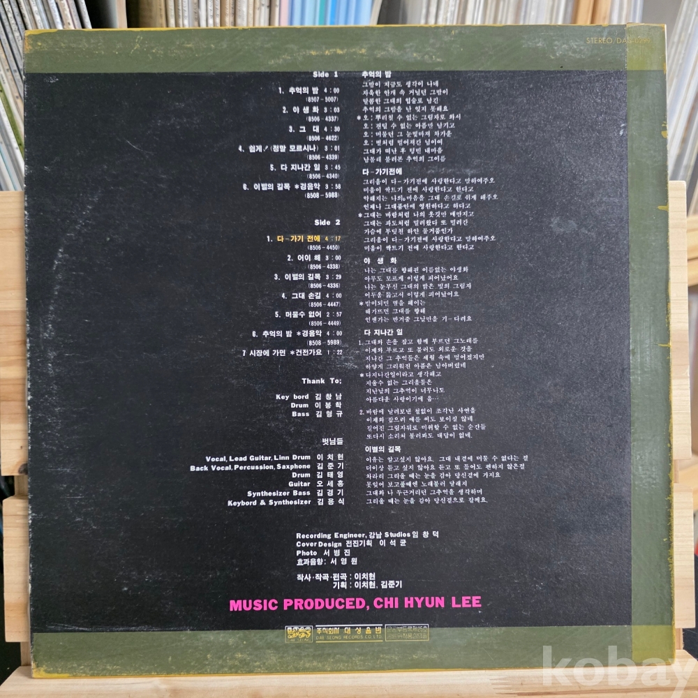 | 자켓상태 | G : 눈에 띄는 손상, 테이프, 필기 존재 | 음반상태 | EX : 재생에 영향 없는 가벼운 기스 존재 | 발매정보 | 초반 | 가사지여부 | 무 |
