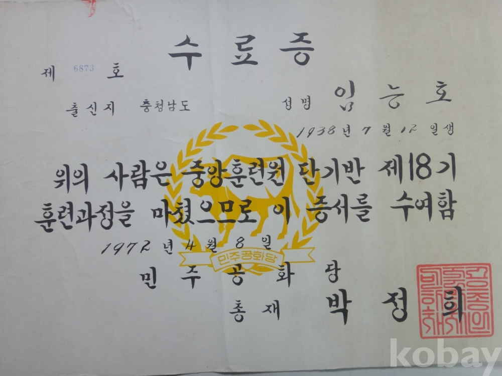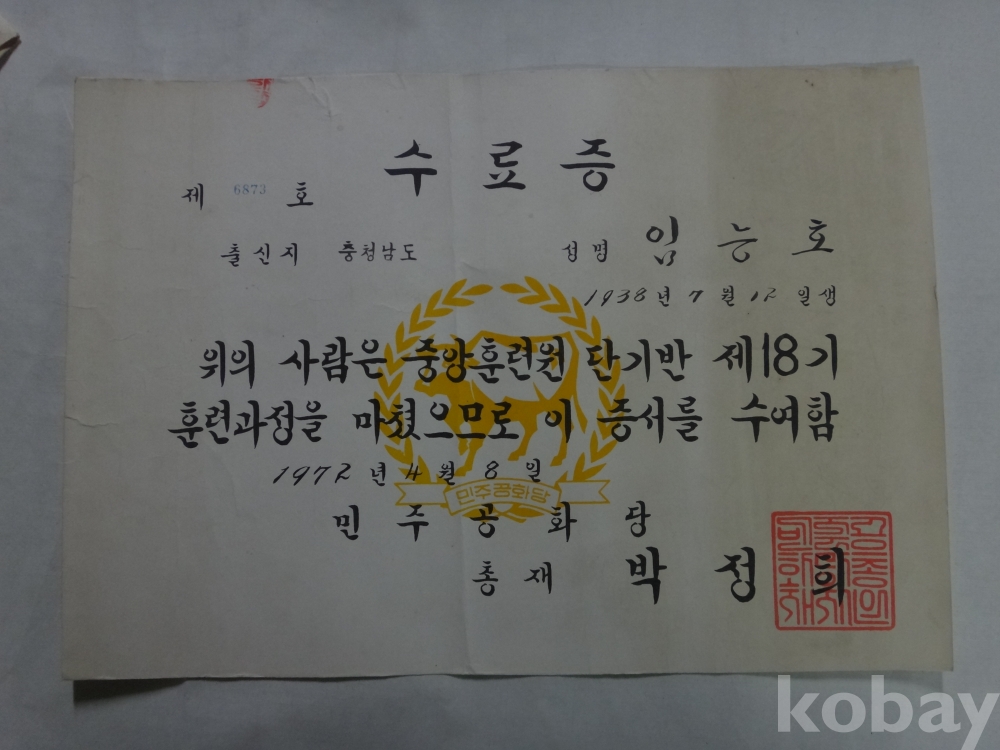 민주공화당 중앙훈련원 수료증 (1972년, 총재 박정희)