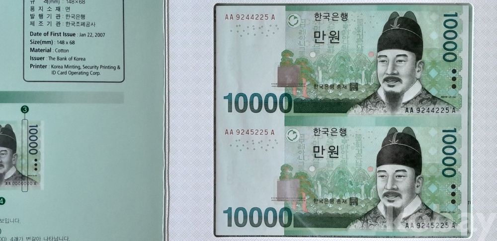 한국은행 바 10000원권 2면/최초 발행 2007. 1. 22(AA 9244225 A, AA 9245225 A) 연결형은행권 입니다.