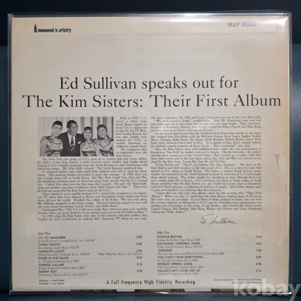 Their First Album/Mono 버전 1963년 미국 현지 레이블 모뉴먼트(Monument)에서 발매한 음반을 국내로 공수해 화제를 모았던 김시스터즈의 첫 정규 음반입니다. 미국 현지에서 제작해 히트를 기록한 김시스터즈의 첫 정규 앨범은 한국 가수로는 처음으로 아메리칸 드림을 이뤄낸 명반이다. 이 앨범은 Stereo와 Mono 두 버전으로 출시되었고 Mono 버전이 더 귀합니다.