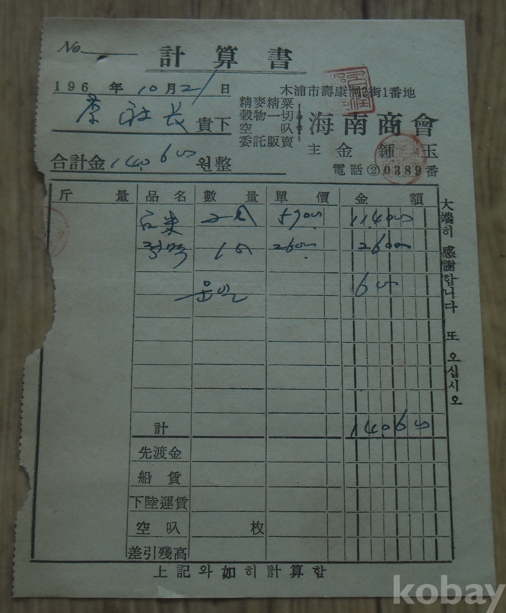 옛 영수증(계산서): 1969년 해남상회(목포)