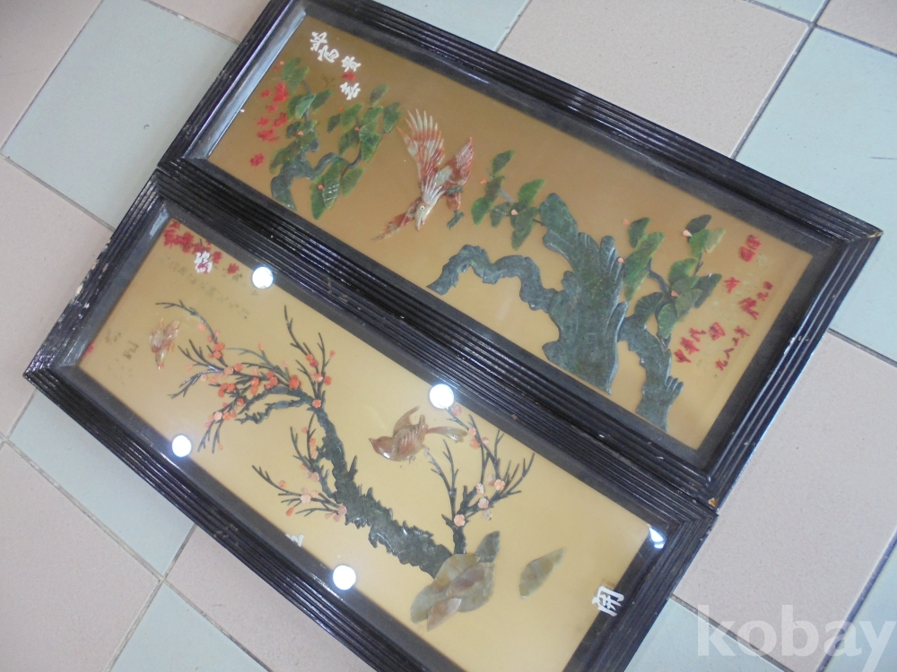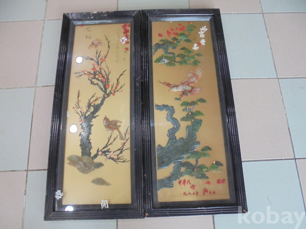 정성이 많이들어간 옥돌을 일일이 조각하여 붙인 만든지 오래되여 안에글씨만 떨어진데있는 색깔옥돌로 노송과 학 고매화와 새 액자붙여