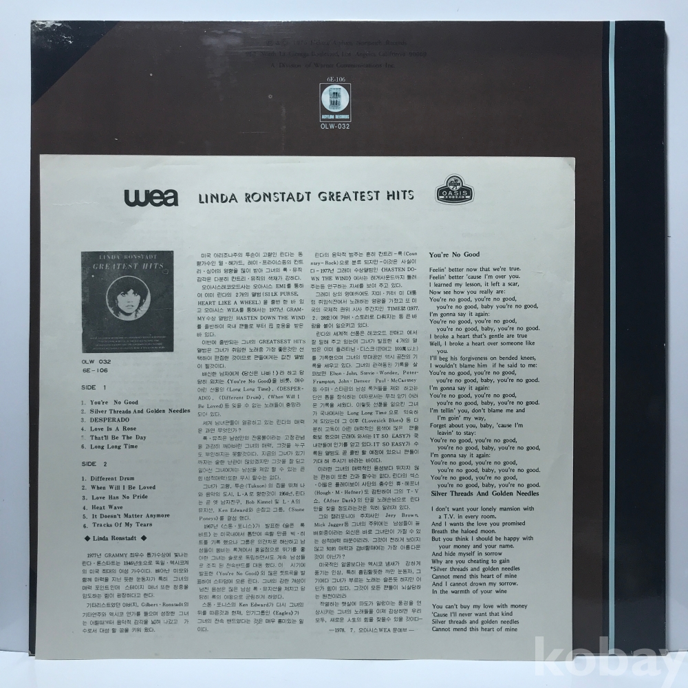 LP 82,350-7 LINDA RONSTADT GREATEST HITS . 자켓 EX 알판 NM 78 년제작 국내반
