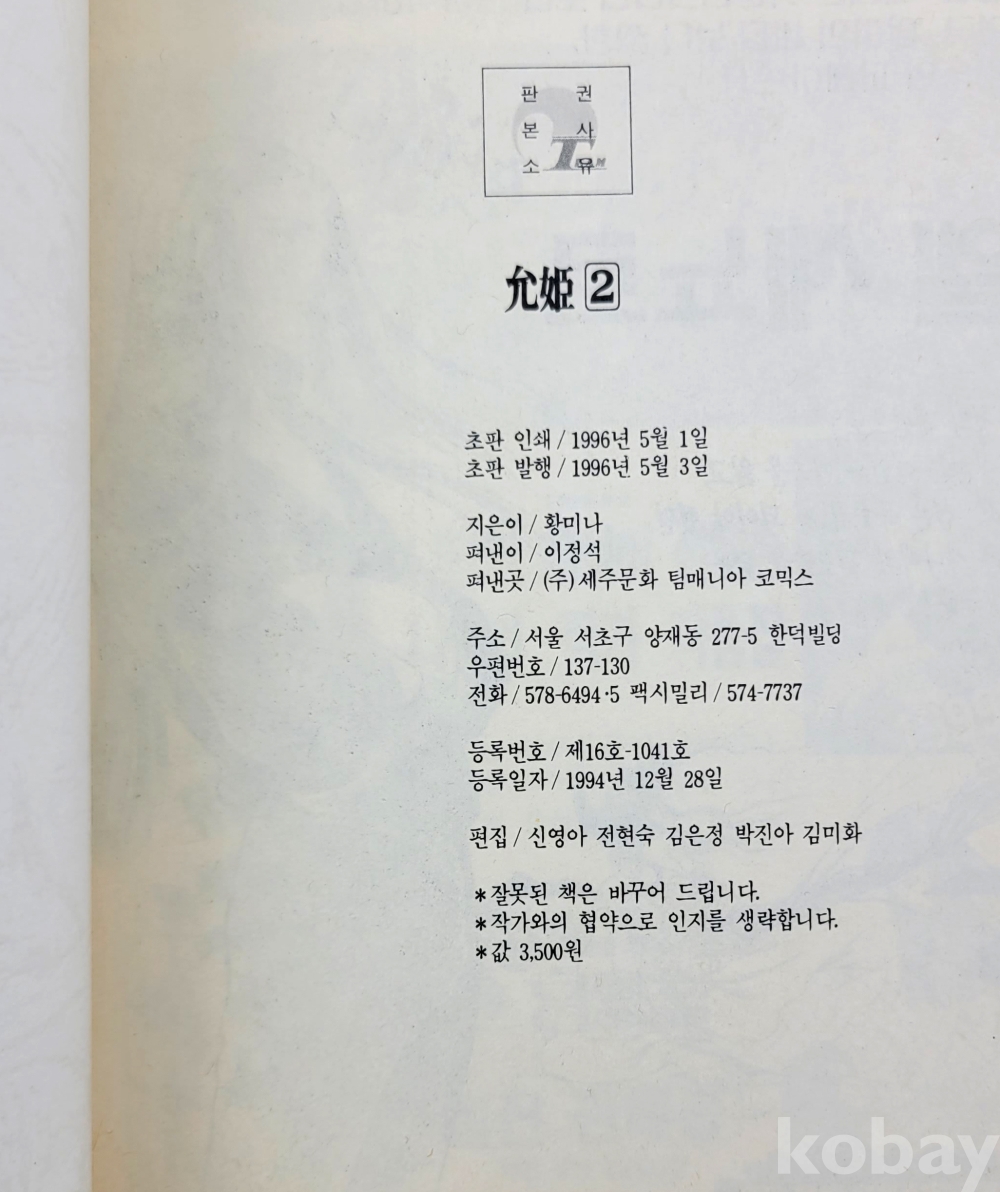 물 품 명 | [팀매니아코믹스] 황미나 / 윤희 1,2완결 총2권 / 1996년 초판 / 세주문화 |