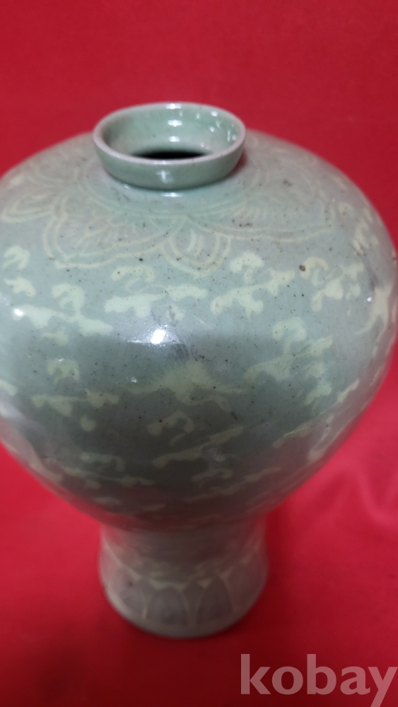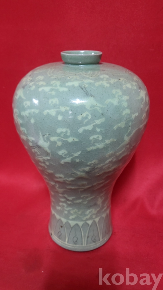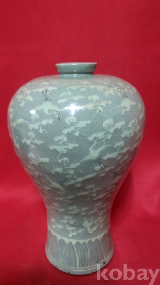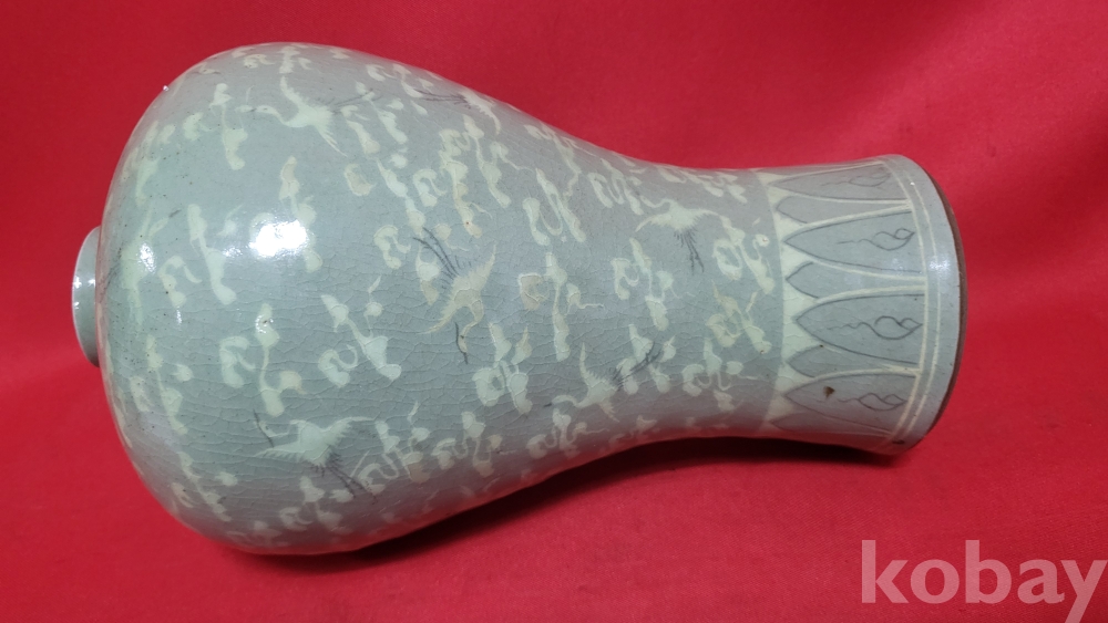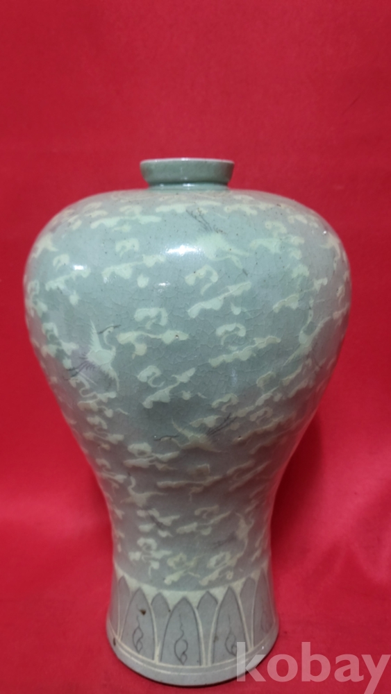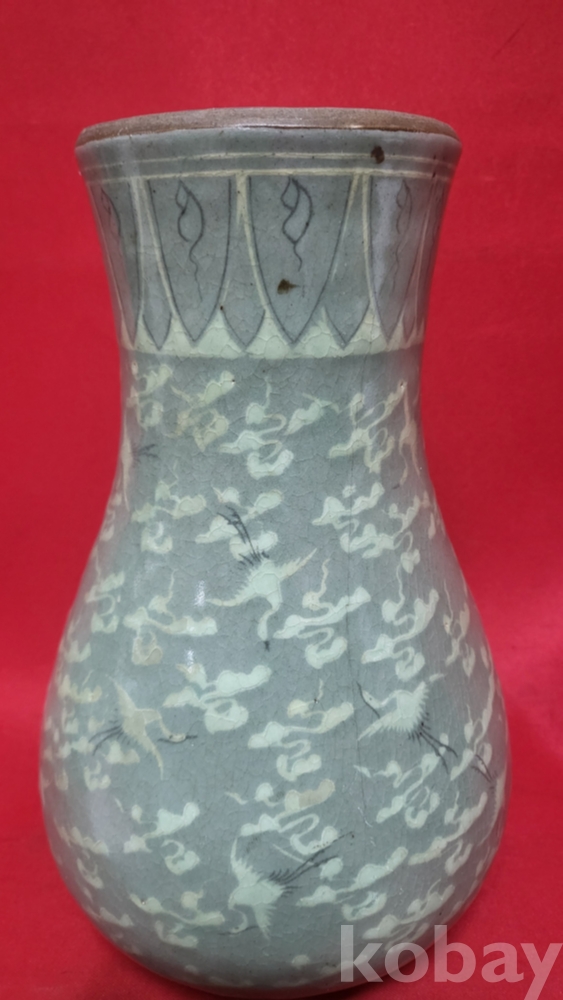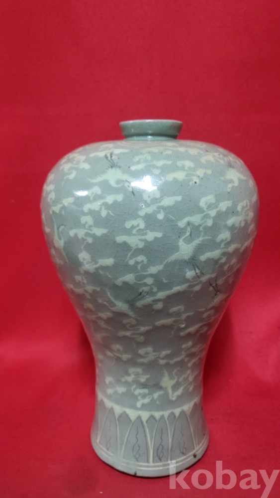 유명 도예가 수결이 보이는 청자 구름과 학(雲鶴)문양 매병입니다,