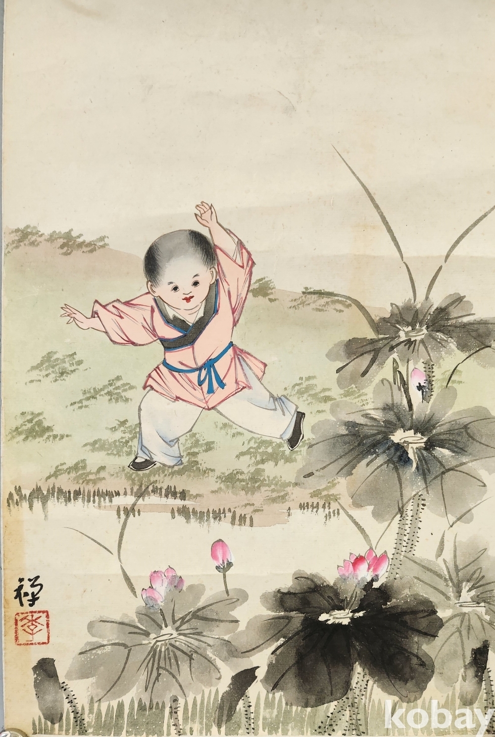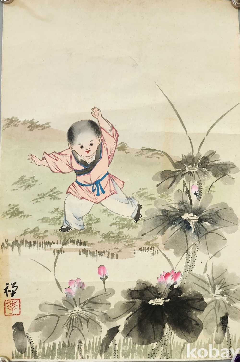 선(禪) 수결이 보이는 종이에 채색한 연꽃과 동자가 노니는 작품입니다,