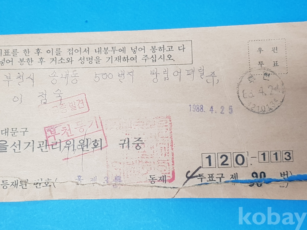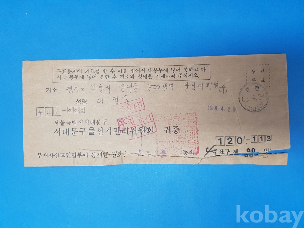 **** [선거우편] 1988년 제13대국회의원선거 부재자우편 실체봉투/부천,88.4.21