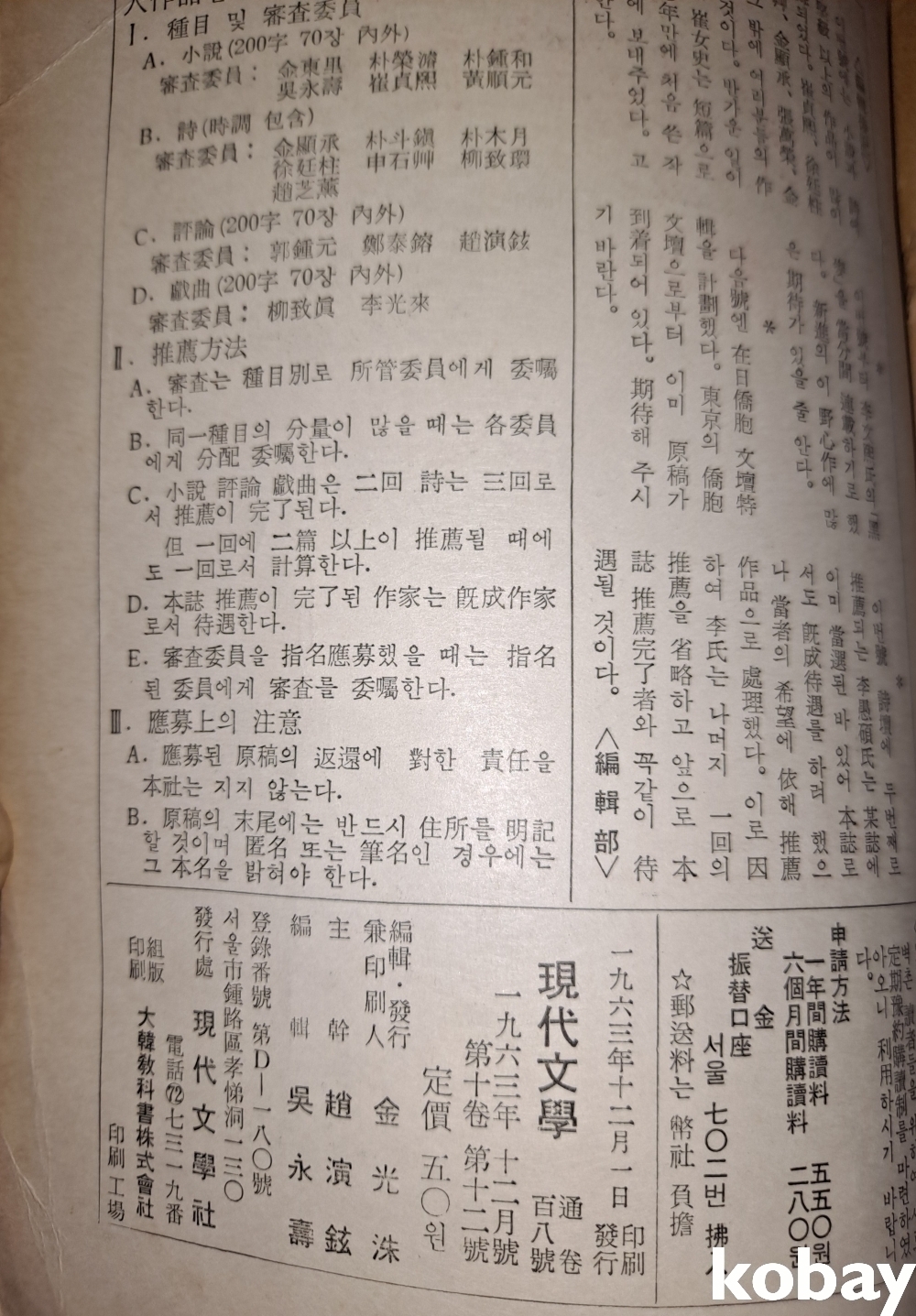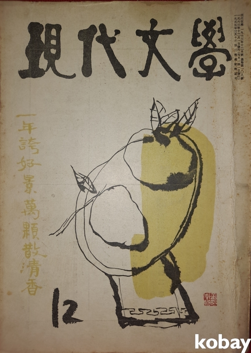 1963년 발행한 현대문학 12 월호 김기창 화가님 표지화입니다,