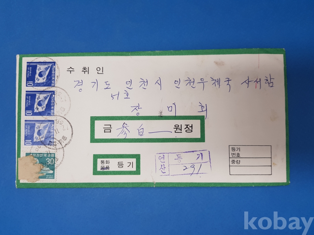 **** 제1차그라비아 30원 오리수적,10원 태극기 3매 첩부 통화등기 실체*충남연산,72.11.20