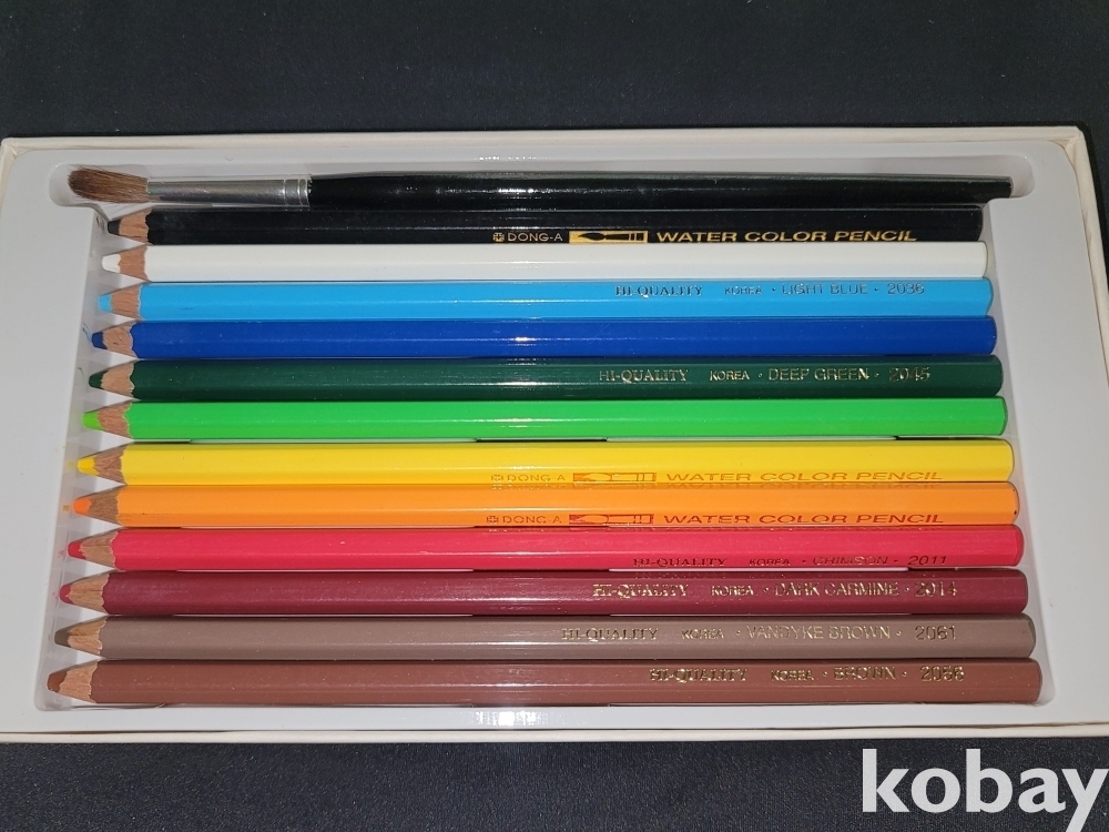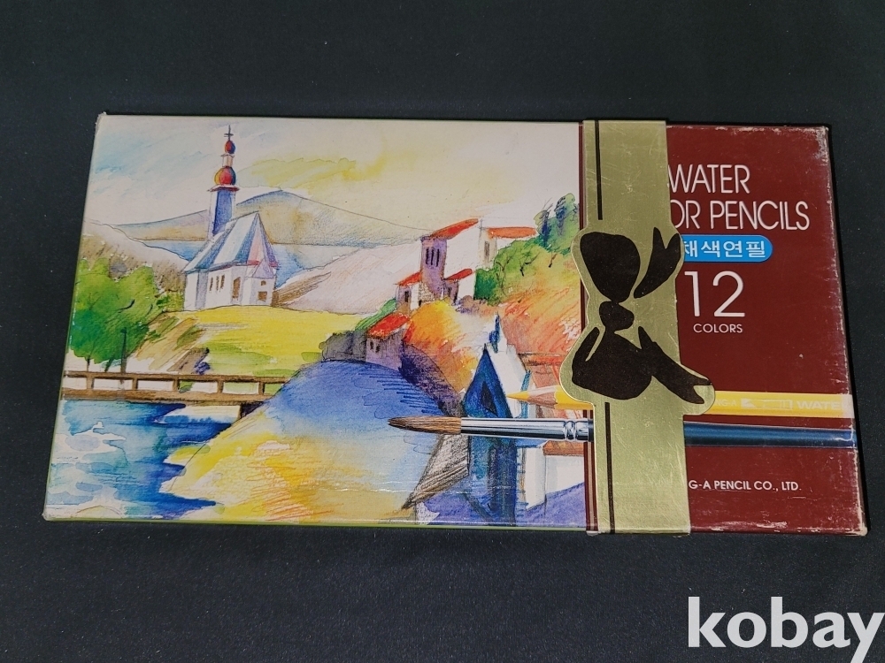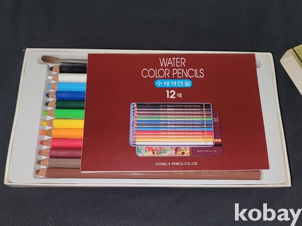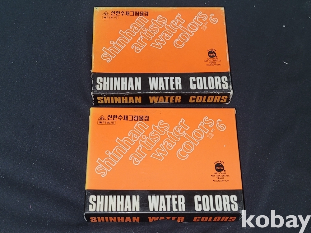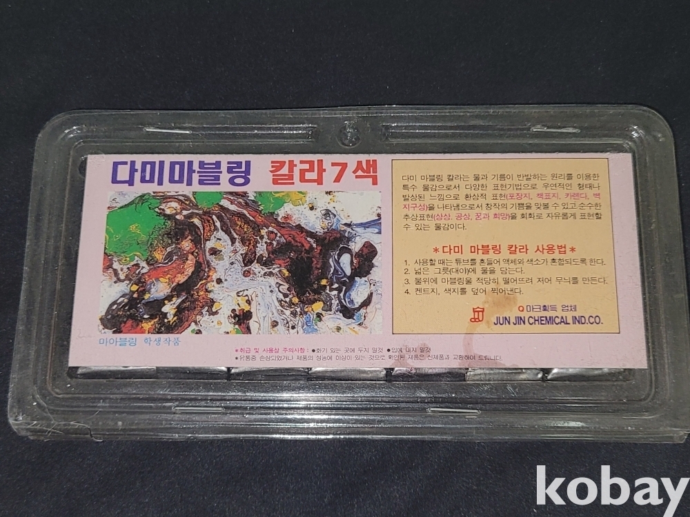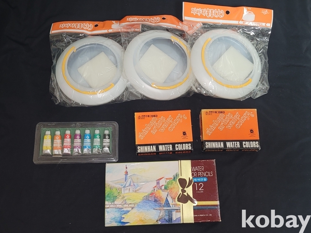 자바라 물통 3개, 다미 마블링 칼라 7색 물감, 1991년 신한수채그림물감 2종 8개, 동아 수채색연필 12색 등 7종 일괄입니다.