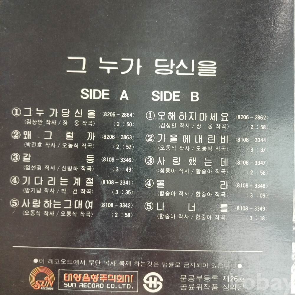 | 자켓상태 | EX : 약간의 마모, 모서리 찢김 존재 | 음반상태 | EX : 재생에 영향 없는 가벼운 기스 존재 | 발매정보 | 초반 | 가사지여부 | 무 |