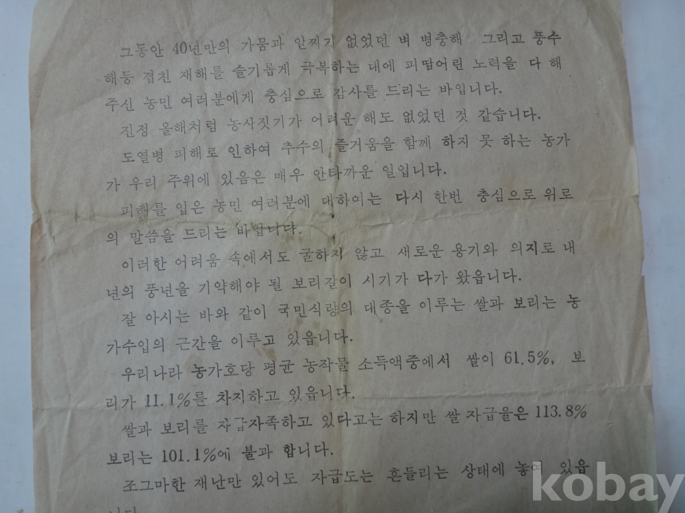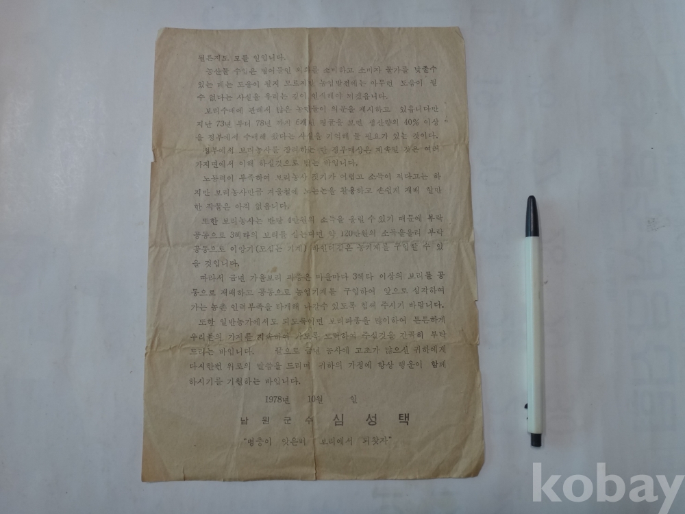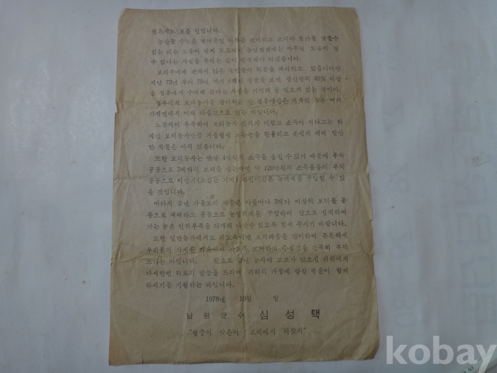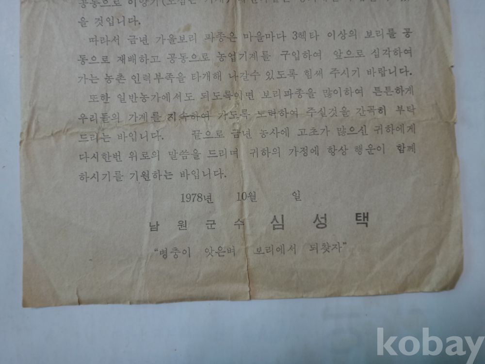 남원군수 - 가을보리 파종 안내문 (병충이 앗은벼 보리에서 되찾자 (1978년)