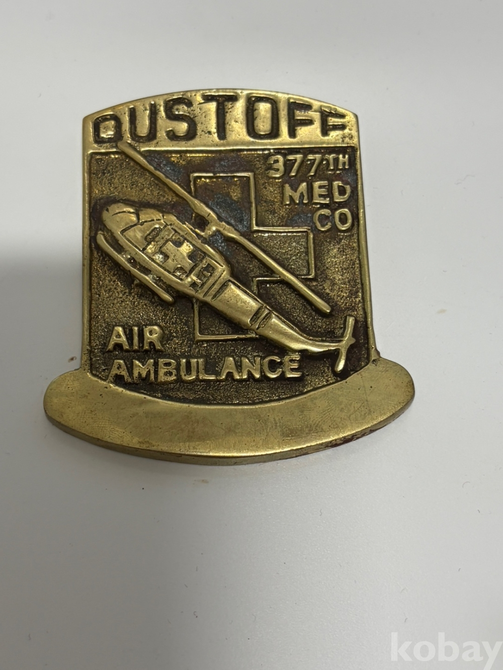 상단에는 "DUSTOFF"라는 글자가 새겨져 있는데, 이는 미군 의무 후송 헬리콥터의 호출 부호입니다."377TH MED CO"는 377 의무 중대를 의미합니다."AIR AMBULANCE"는 항공 구급대를 뜻하며, 중앙에는 헬리콥터와 의료를 상징하는 십자가 문양이 있습니다.