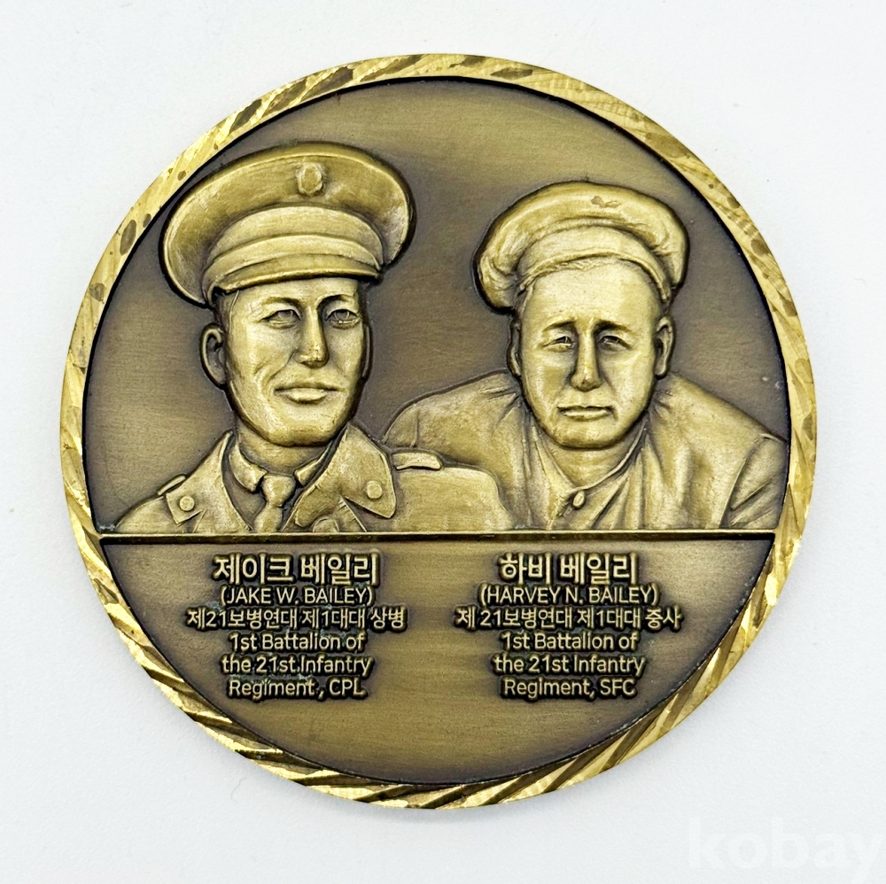 상품 설명 | 2024년 유엔군초전기념관에서 증정한 스미스 특수임무부대 추모 기념 메달 1점이다. 앞면에는 추모비가 뒷면에는 제이크 베일리와 하비 베일리의 모습이 보인다. | ||