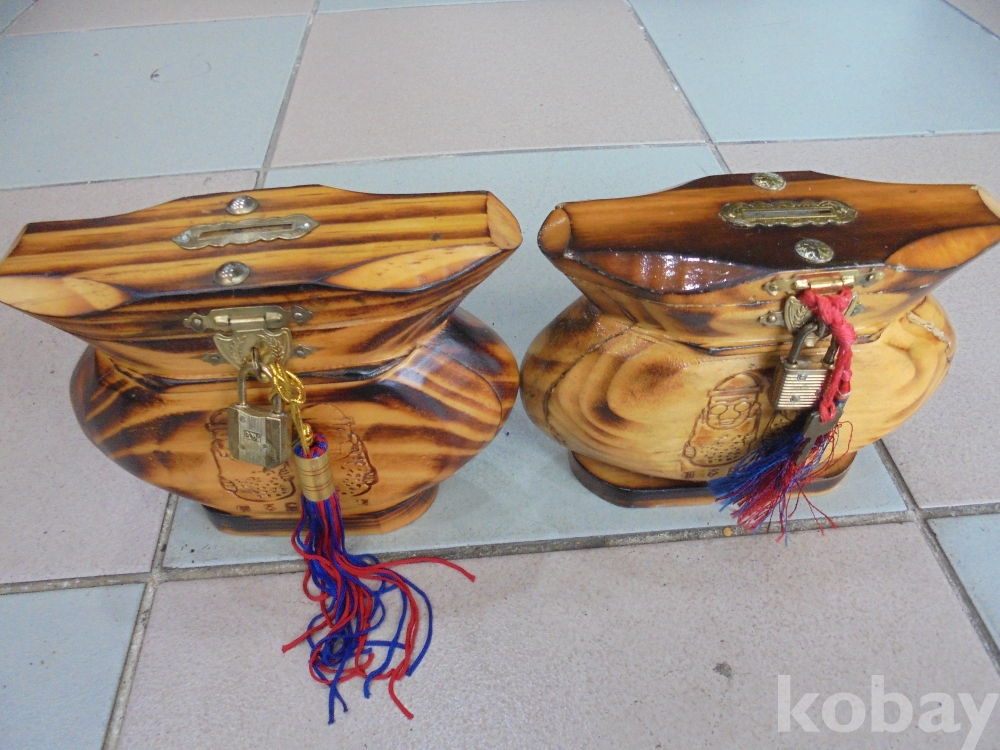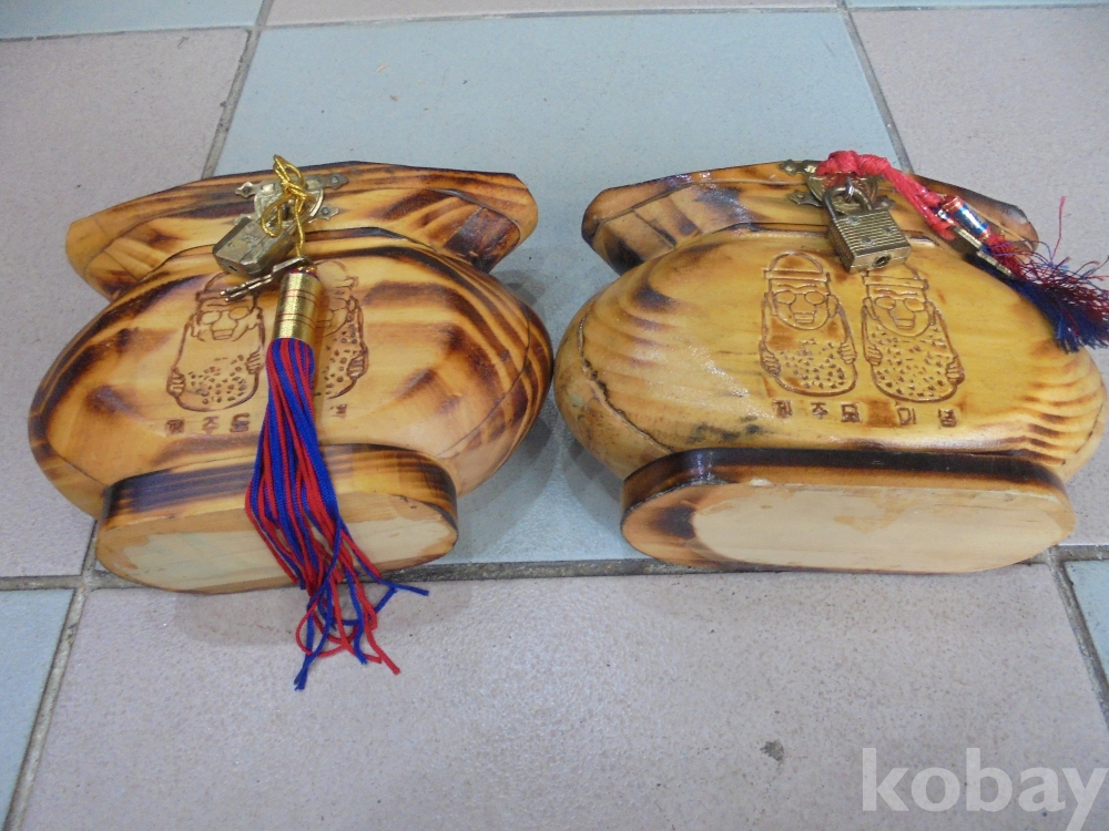 통나무에 뚜껑이있는 앞면에 자물쇠와열쇠달리고 저금통이 돈이차면 열쇠로여는 전통 돈주머니처럼생긴 통나무 하루방저금통 2점