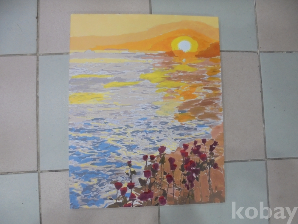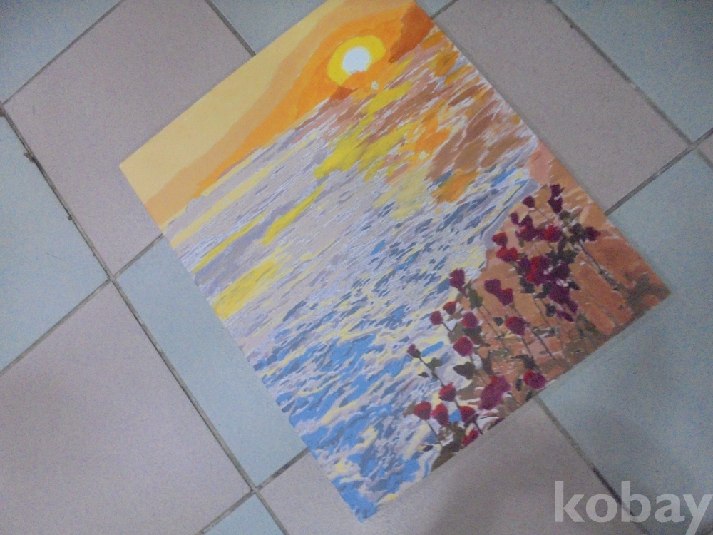 희망의 동해바다 일출과 기분좋은 최고 아름다운 장미류같은 빨강꽃으로 희망적이고 아름다운 바다의 일출과 빨강꽃 유화 판넬