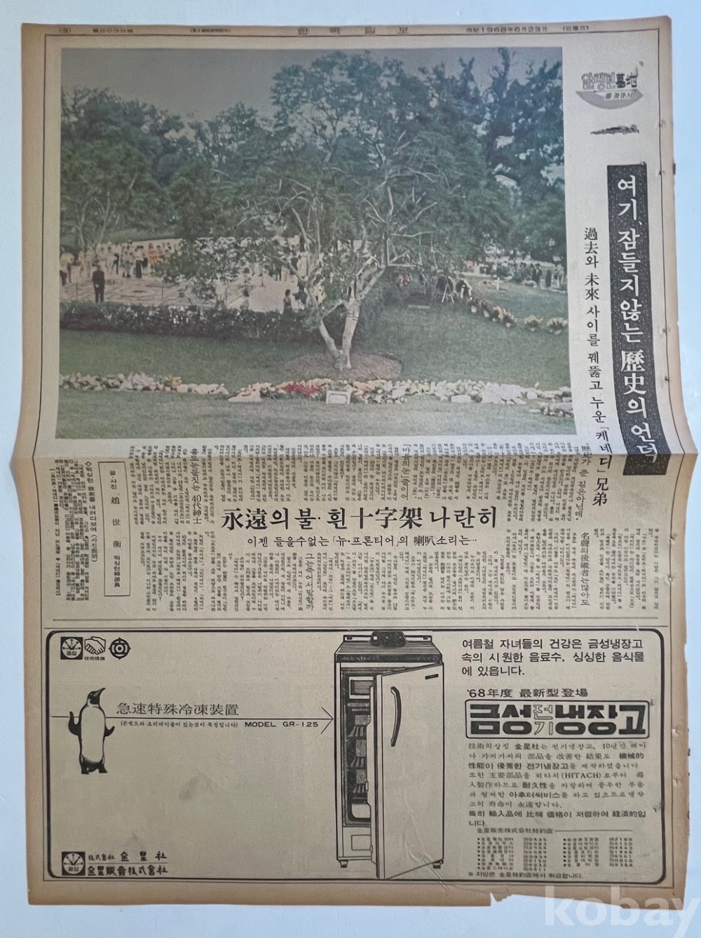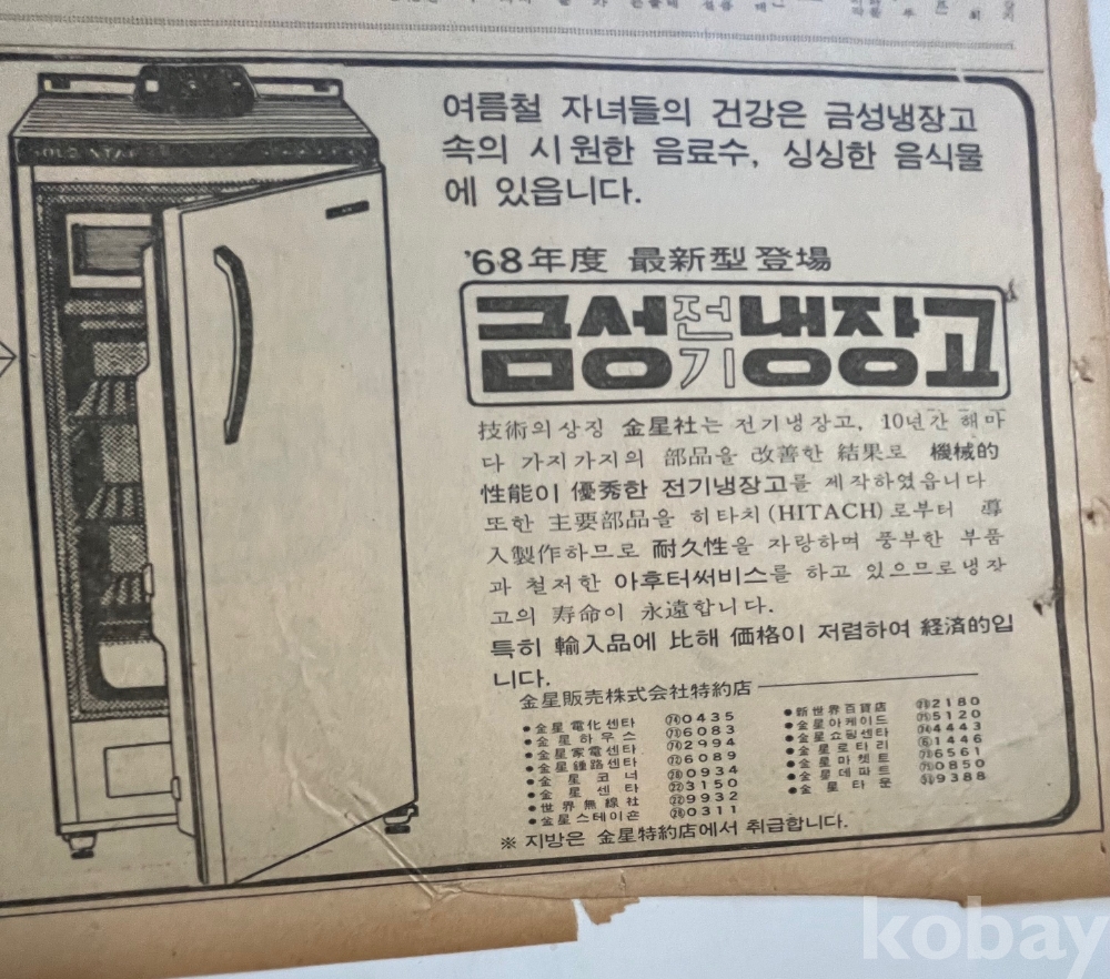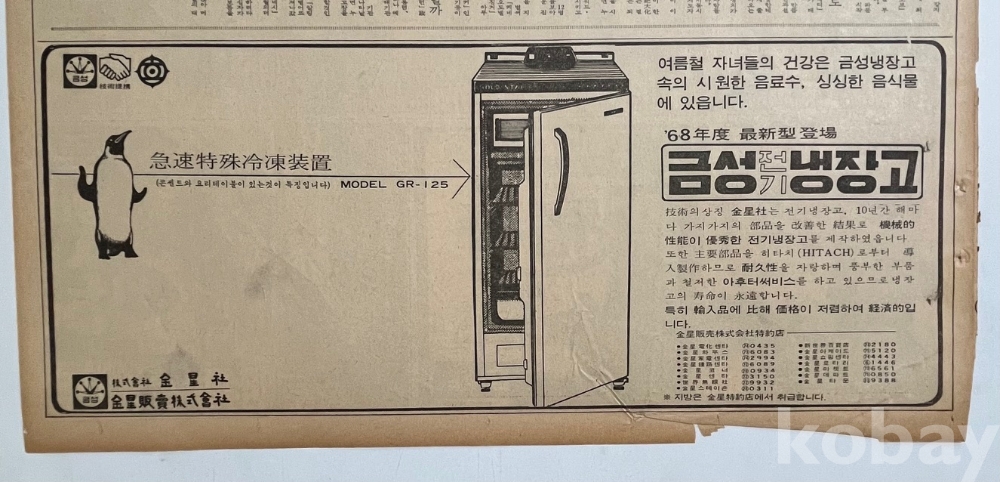 금성 냉장고 광고가 실린 1968년 한국일보 낱장입니다.
