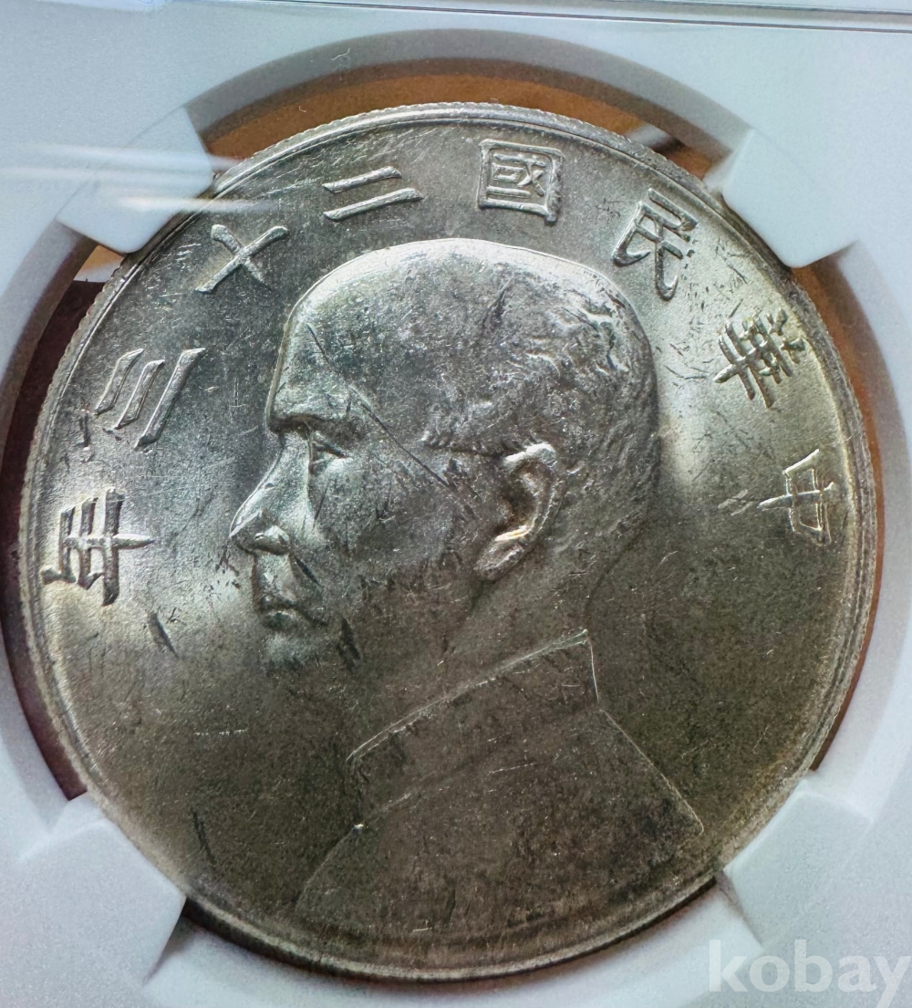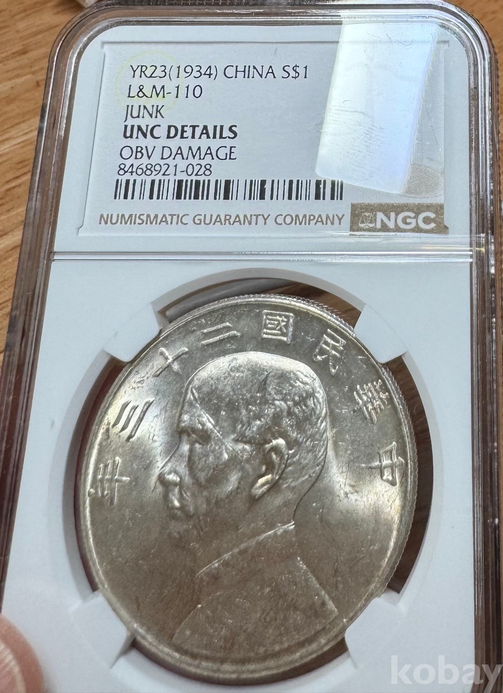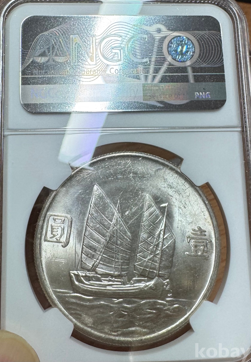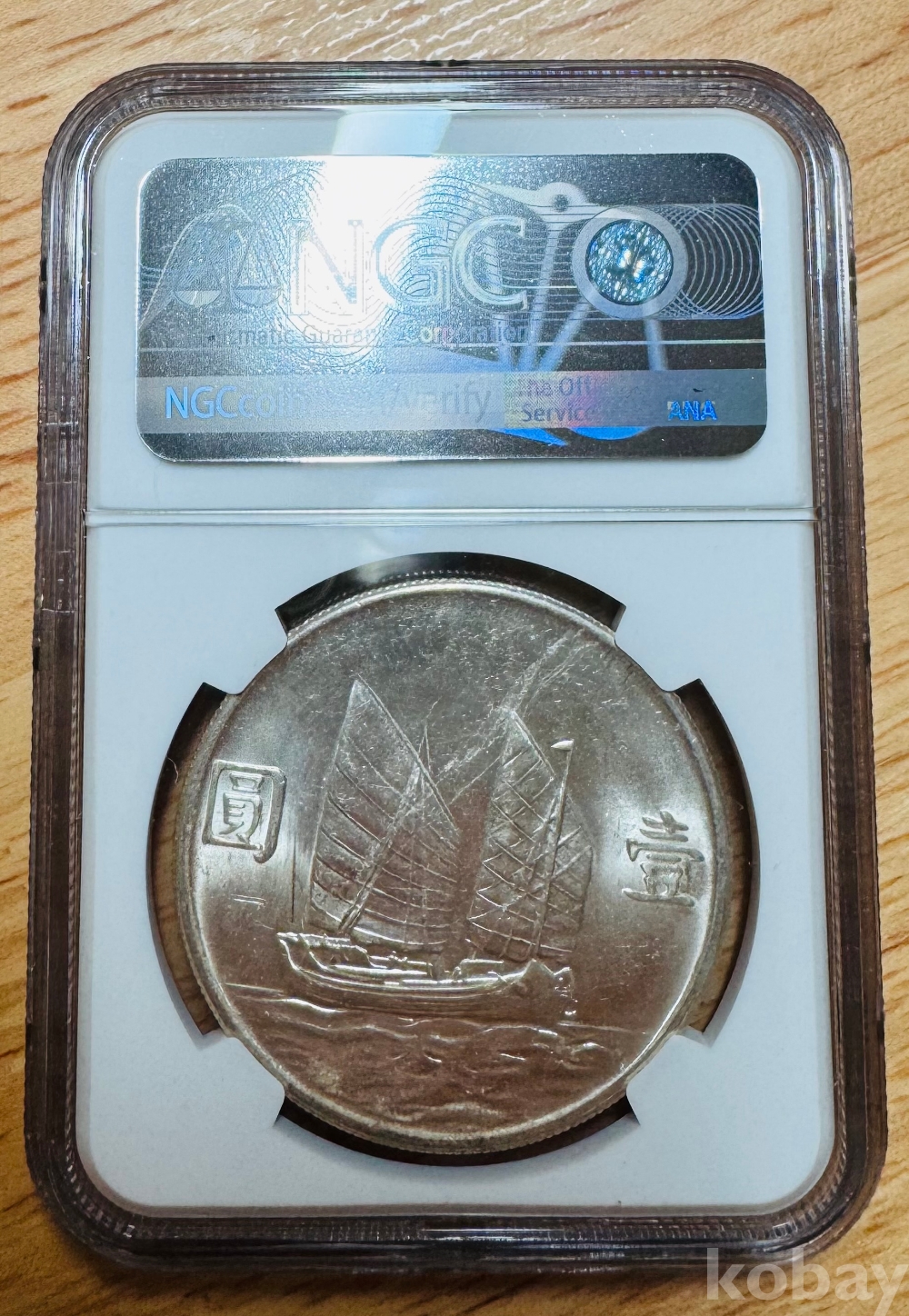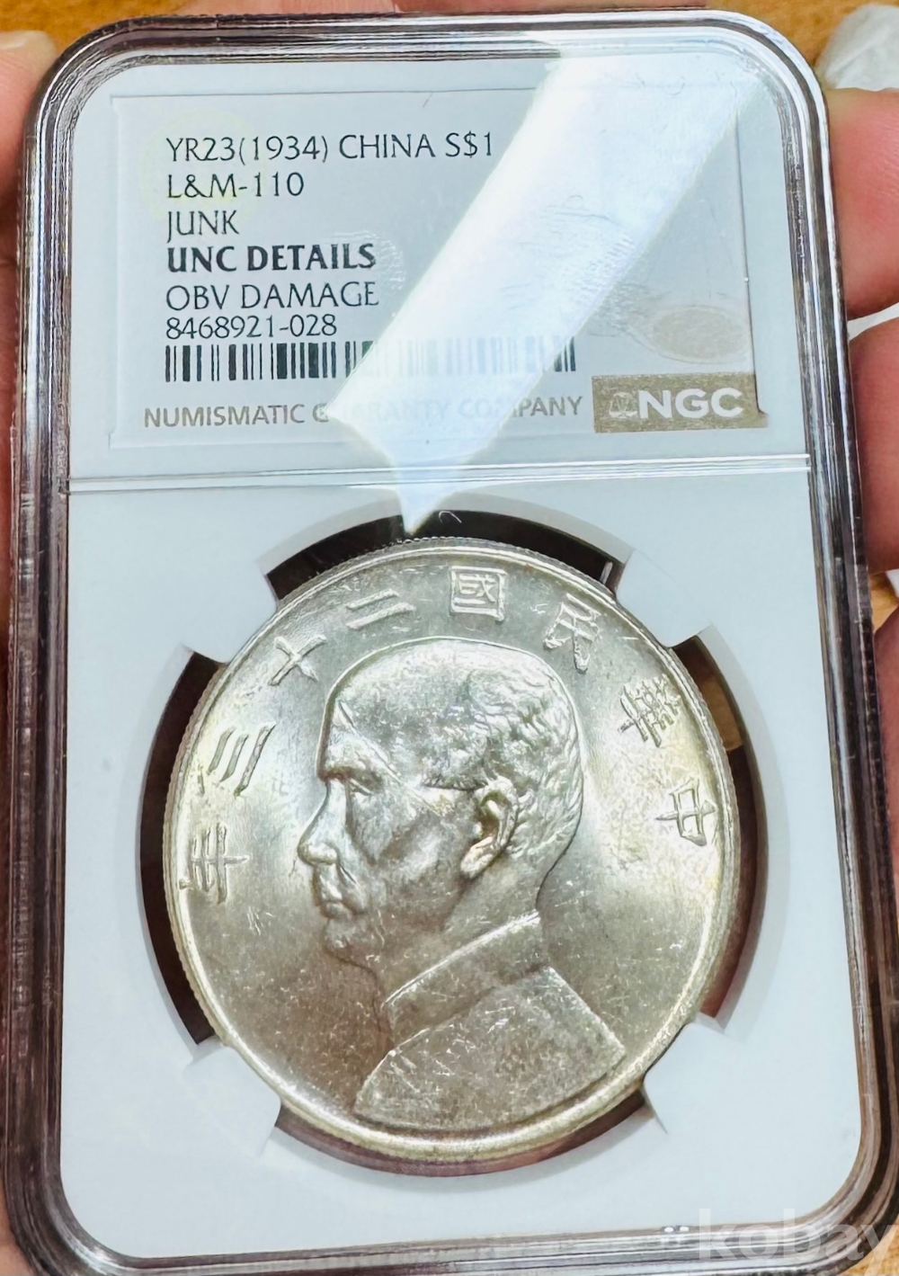 이 주화는 중국에서 가장 유명한 은화 시리즈 중 하나로 1934년 중화민국 손문(쑨원) 1위안 은화(장개석 정부 시기) 입니다. 일명 “쑨원 Junk Dollar” 라고 불리는 타입이에요.