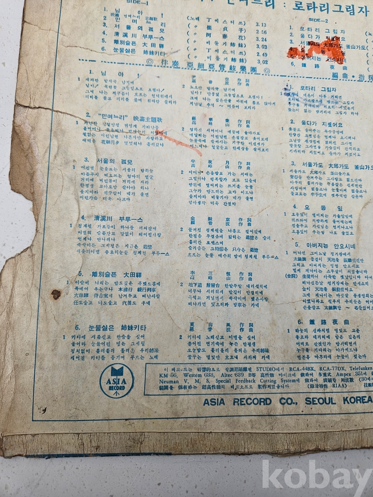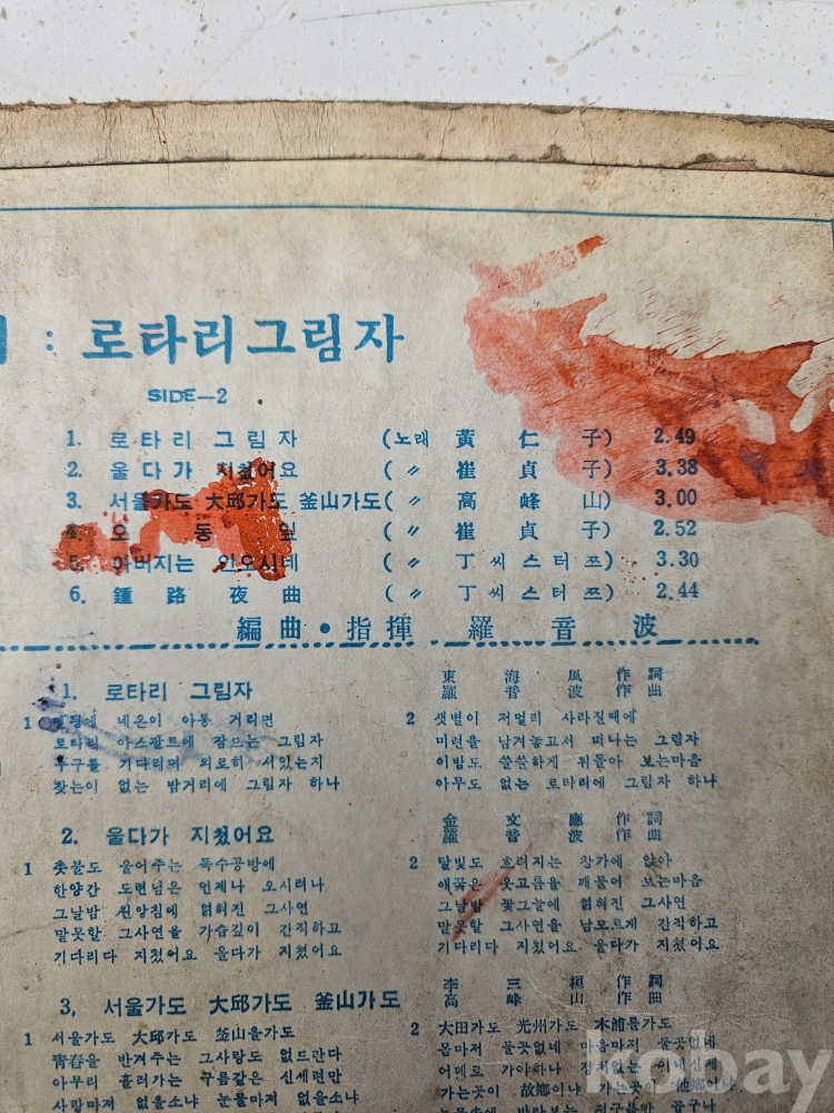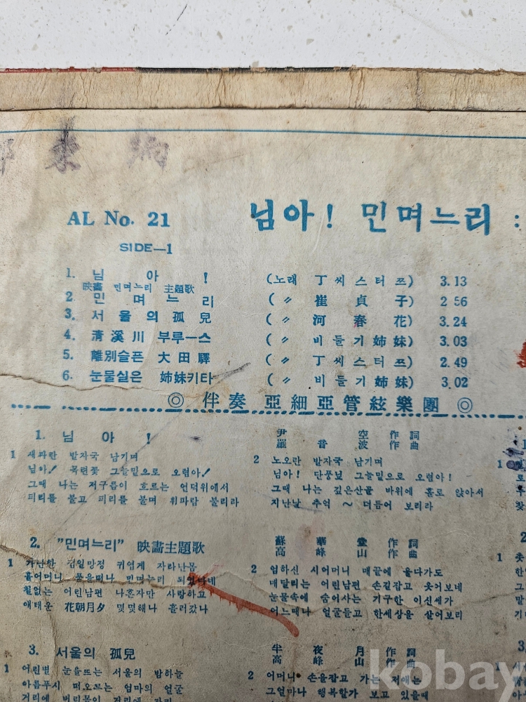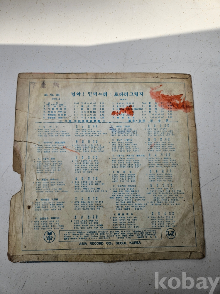 | 자켓상태 | VG : 주름, 접힘, 모서리 찢김 다수 | 음반상태 | VG : 생활 기스 다수, 가벼운 노이즈 존재 | 발매정보 | 초반 | 가사지여부 | 무 |