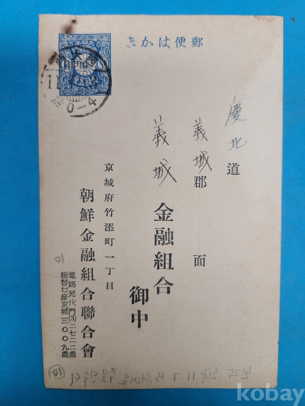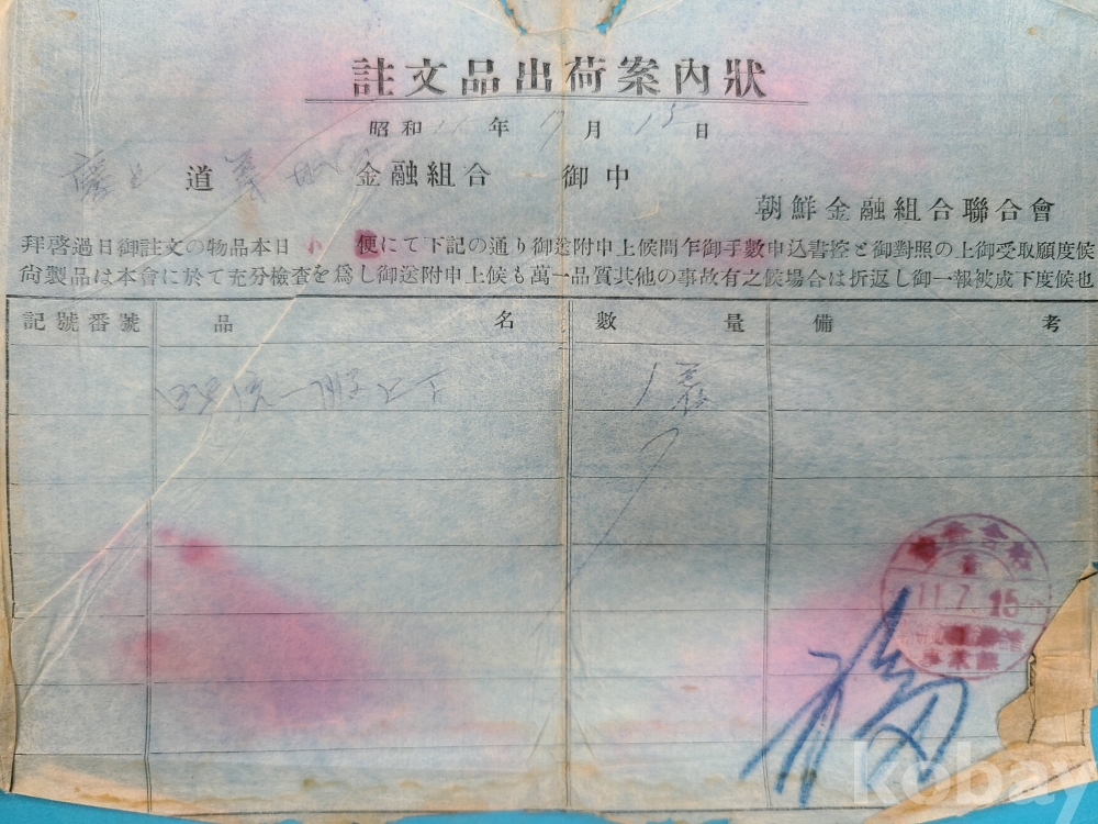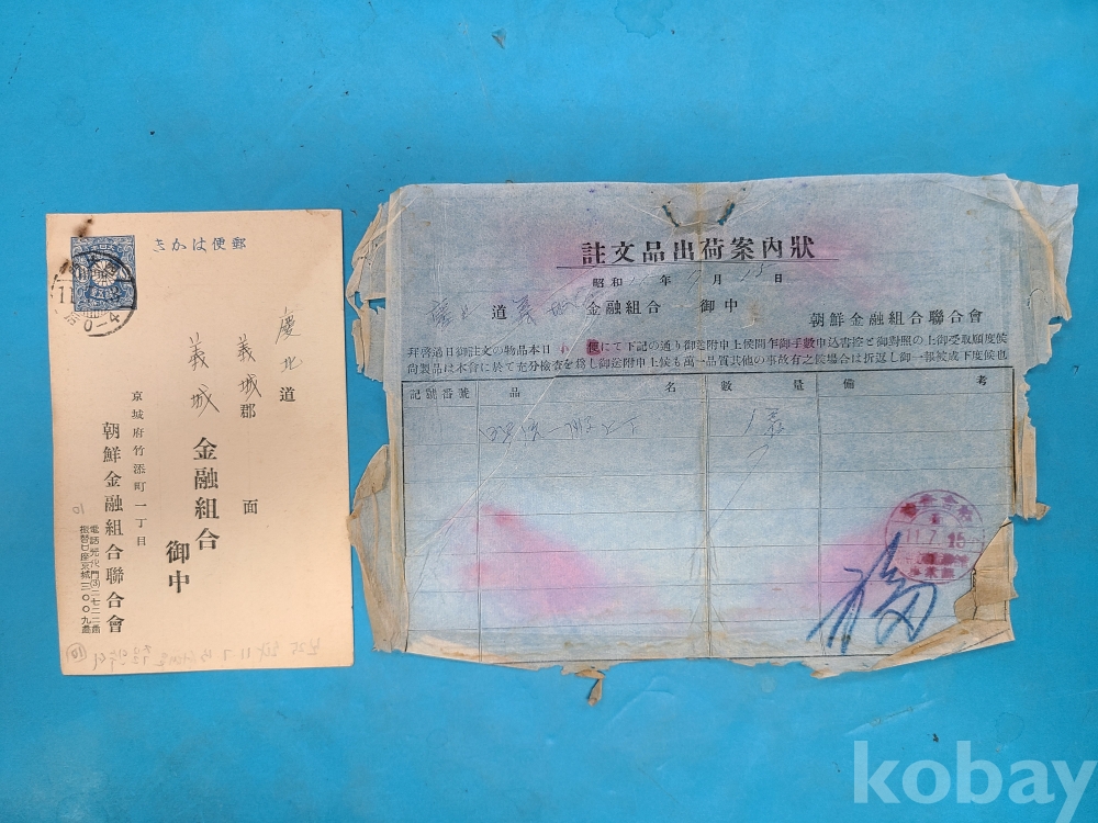 **** 1936년 조선금융조합연합회에서 의성금융조합으로 보낸 우편엽서, 주문품출하안내장