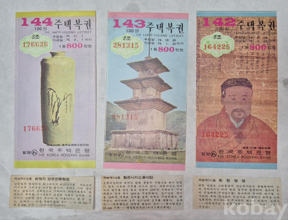 주택복권 제142, 143, 144회 및 당시 신문 스크랩입니다.