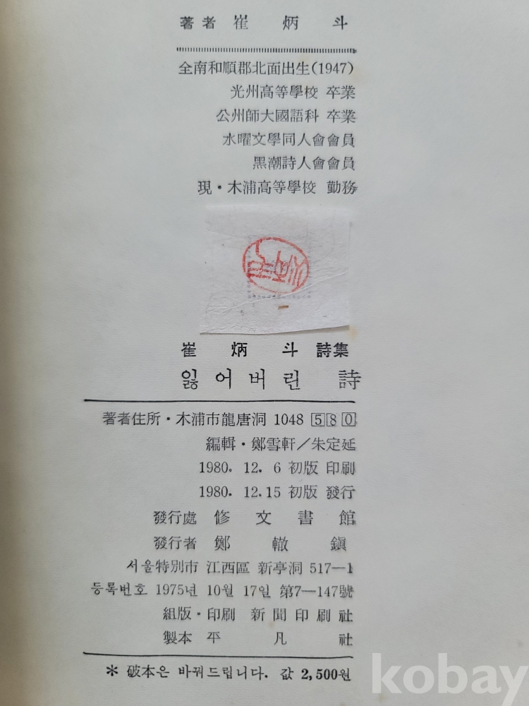 최병두(전라남도 화순: 1947~2012) 처녀시집.