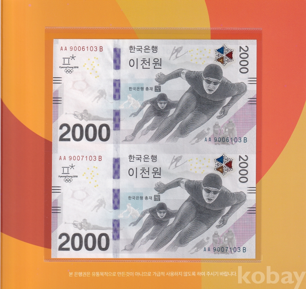 - 2018년 평창 올림픽기념 2,000원 초판 AAB 9006103 / AAB 9007103 - 2연결권 미사용 지폐 입니다.