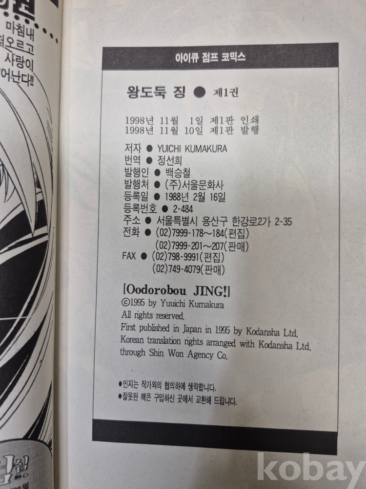 1998년 초판 쿠마쿠라 유이치 작가 왕도둑 징 1권 부터 7권 까지 완결