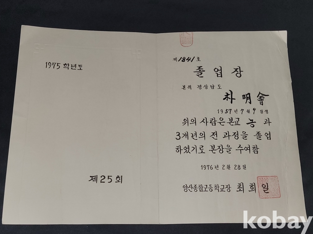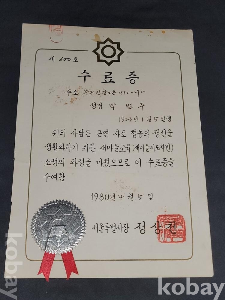 1976년 양산종합고등학교 졸업장, 1980년 서울특별시장 수여 새마을 교육(새마을지도자반) 수료증 등 6장 일괄입니다.