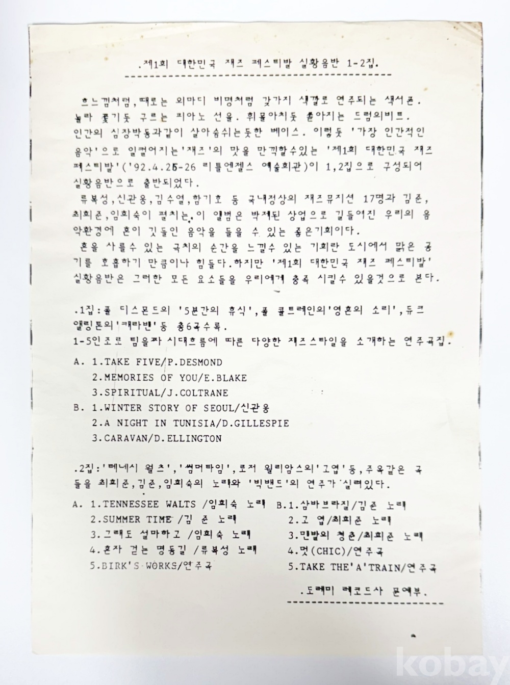 상품 설명 | Side A 1. TAKE FIVE 2. MEMORIES OF YOU 3. SPIRITUAL Side B 1. WINTER STORY OF SEOUL 2. A NIGHT IN TUNISIA 3. CARAVAN | ||