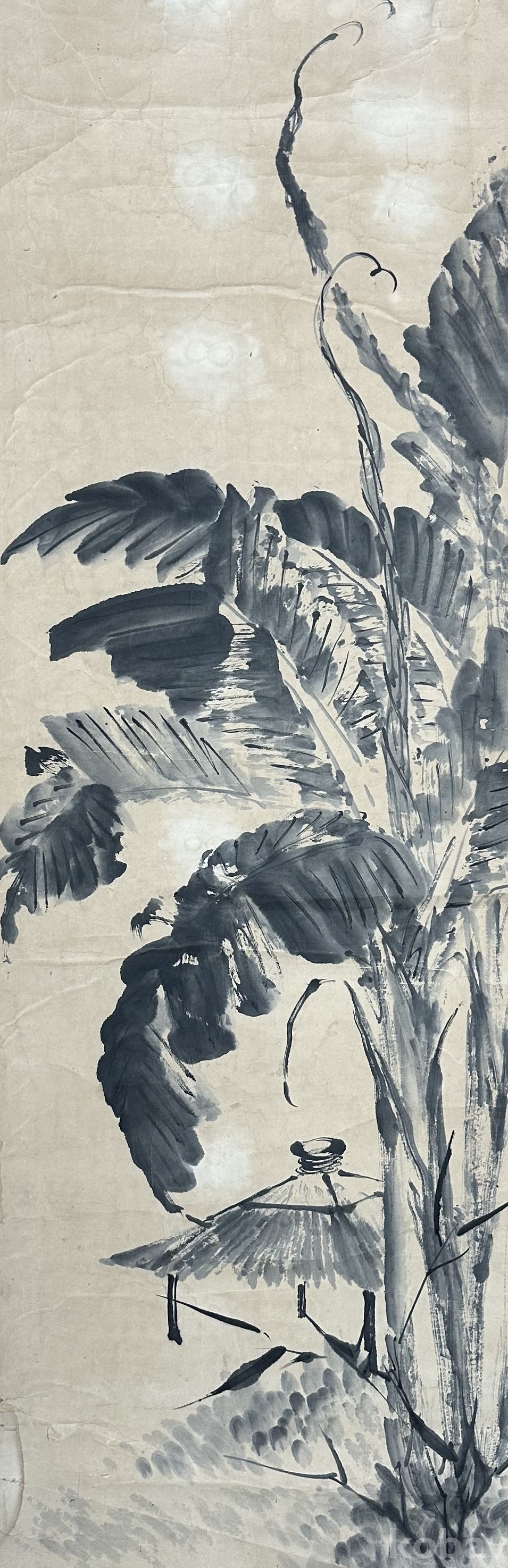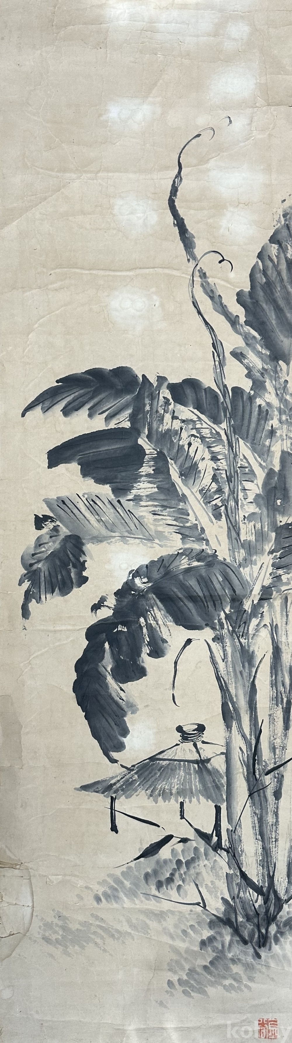 본 작품은 커다란 파초(芭蕉)를 중심으로 그린 수묵화로, 여름의 생동감과 고요한 정취를 동시에 담고 있다. 거친 붓놀림으로 굵은 줄기와 잎맥을 표현하고, 묵의 농담으로 빛과 그림자를 조율하여 자연스러운 공간감을 살려냈다. 하단에는 간결한 낙관 ‘壽’가 찍혀 있으며, 전반적으로 여백의 운용과 필획의 리듬감이 조화를 이루는 전통적 수묵화의 미를 보여준다. 구도상으로는 화면 하단의 평면적 공간과 상단의 상승감이 대비되어, 시선이 자연스럽게 나뭇잎 끝으로 이어지는 구성을 취하고 있다. 보존 상태는 전반적으로 양호하나, 세월로 인한 종이의 갈색 변색 및 일부 주름이 있으며, 약간의 수분 자국이 관찰된다.