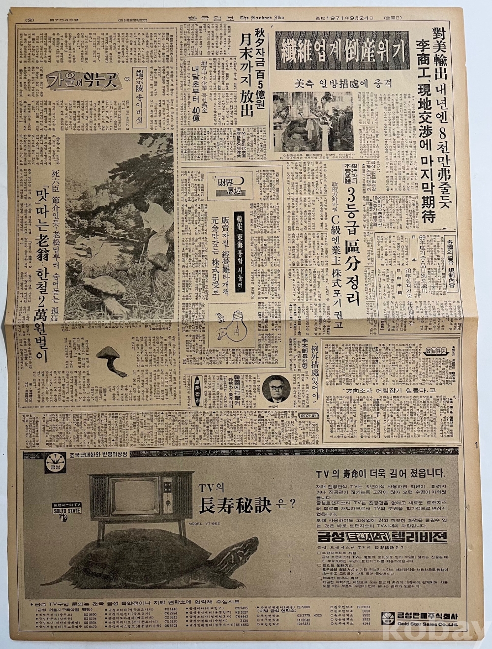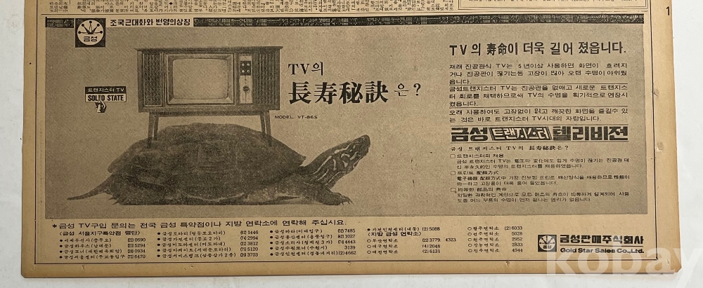 TV 광고가 실린 1971년 한국일보 낱장입니다.